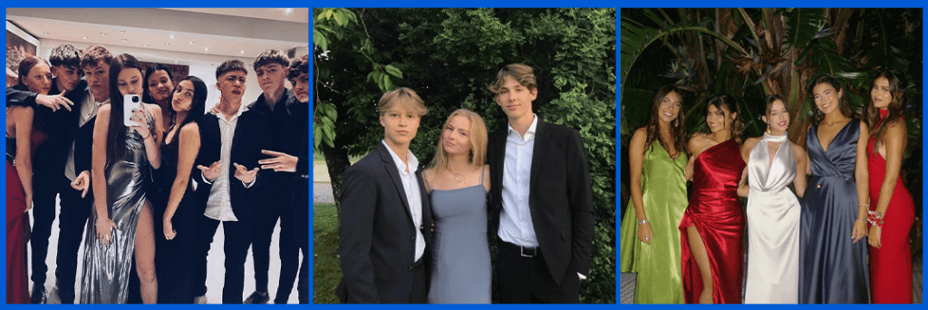 Produções dignas de um grande evento: looks elegantes, produções caprichadas e poses como se todos fossem grandes celebridades. O contraste com a rotina escolar deixa o dia mais divertido e dá aquele gostinho do clima de formatura.