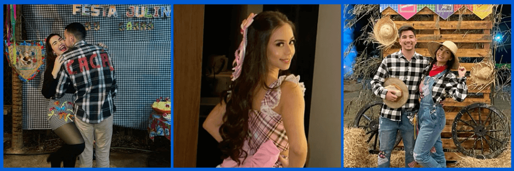 Chapéu de palha, camisa xadrez, vestido xadrez, maquiagem temática e clima caipira.