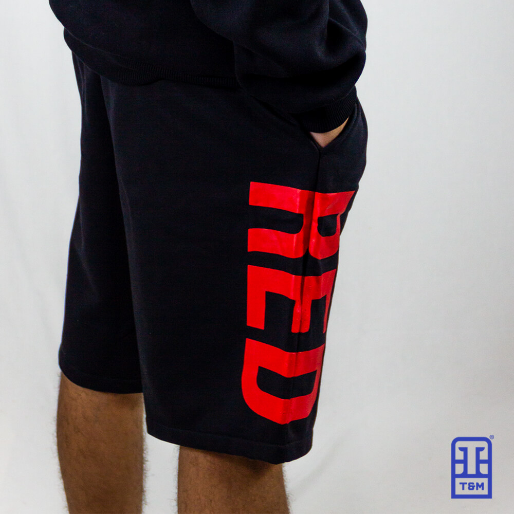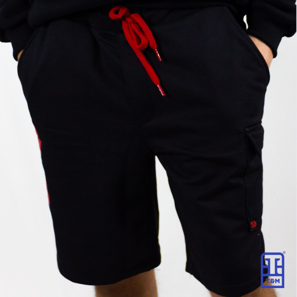 Bermuda de moletom preta com cordão em vermelho, aplicação de bolso e estampa em silk.