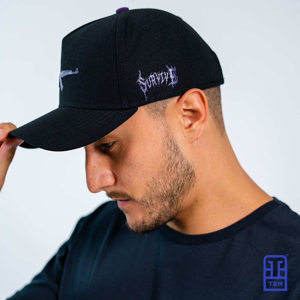 Boné estilo americano preto com aplicação de termocolante em alto relevo na frente e estampa em silk na lateral.
