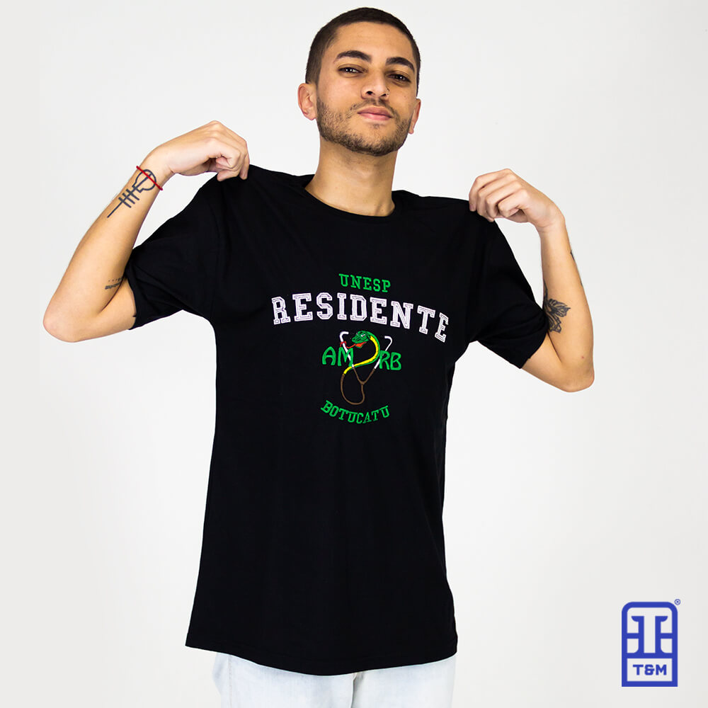 Camiseta preta com mix de bordados, sendo escrito “Residente” em bordado de aplicação e os outros em bordado total.