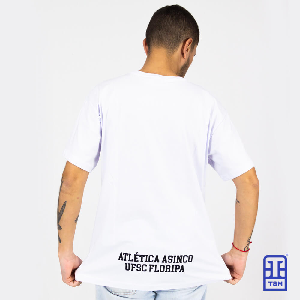Camiseta branca. Frente com estampa em silk, costas com aplicação de bordado total.
