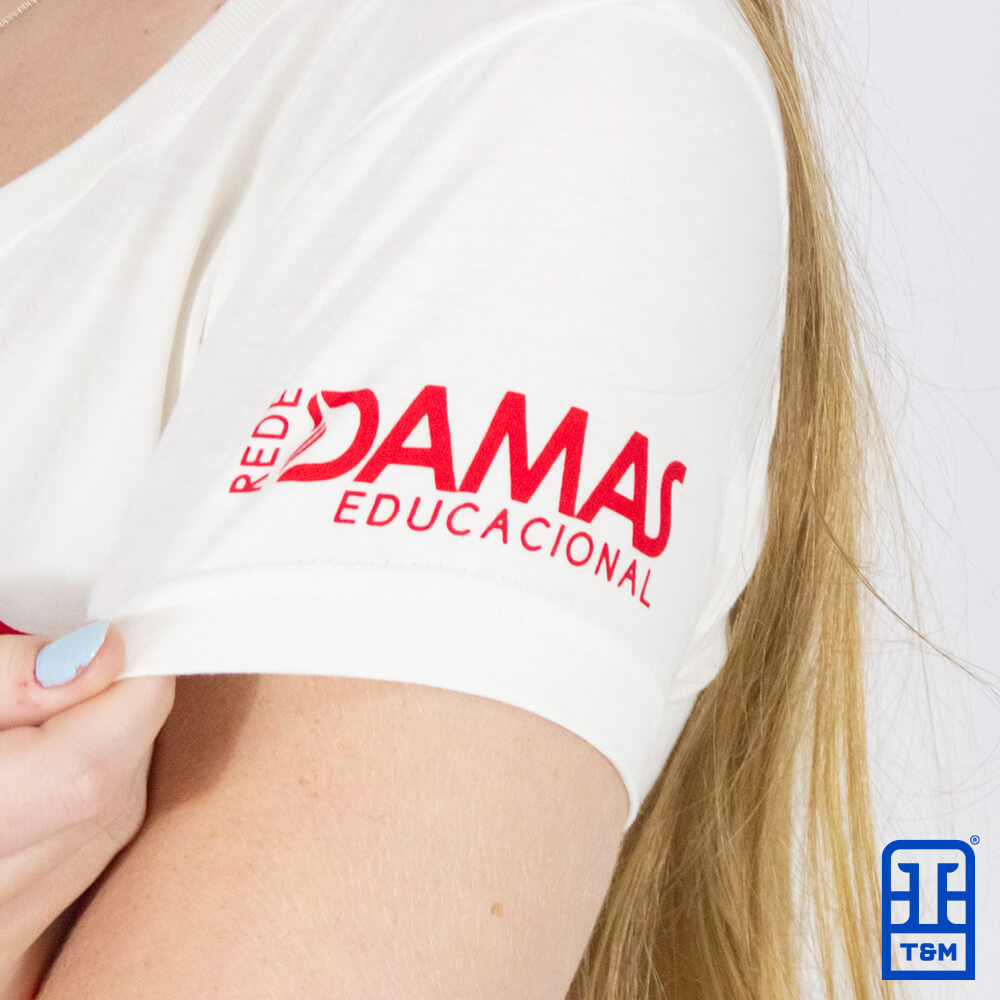 Baby look Champagne, frente e costas com estampa em silk. A Baby look é feita de material 100% algodão fio 30/1 penteado compactado (menos encolhimento na lavagem), com gramatura de 160 g/cm³. Além disso nossa peça possui um reforço na gola ombro a ombro.