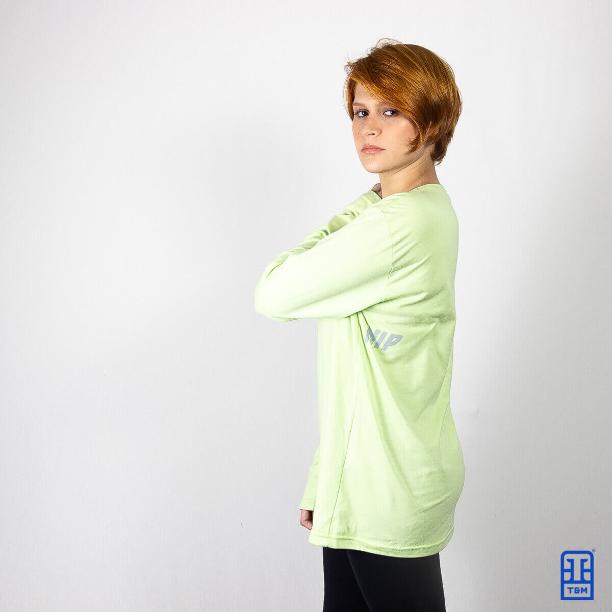Camiseta manga longa verde clara, estampa em silk na frente e em baixo do braço.