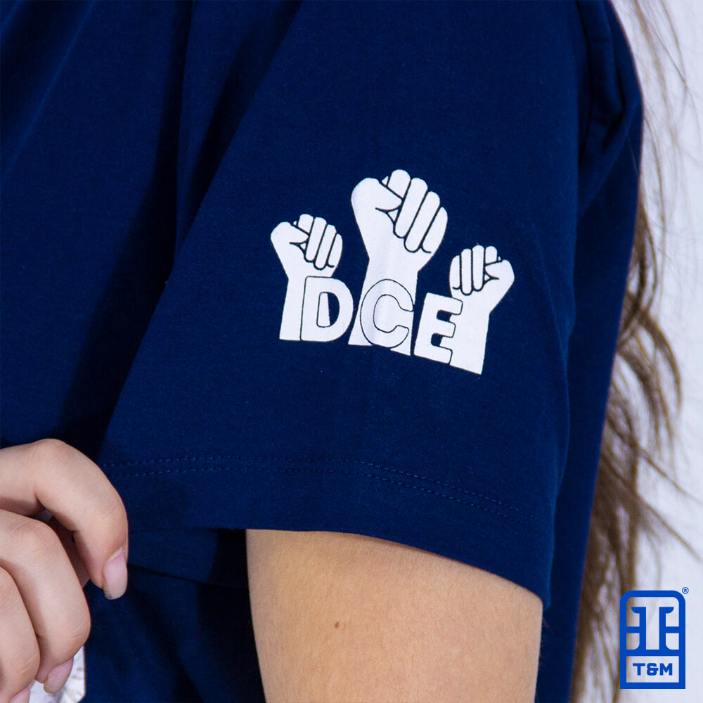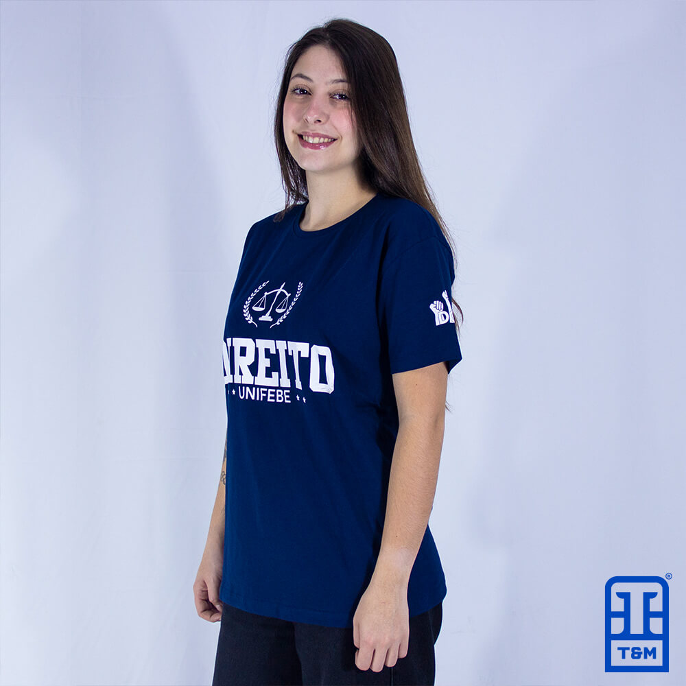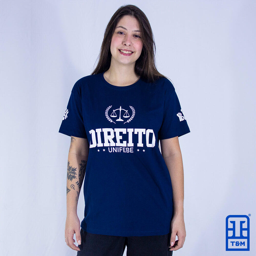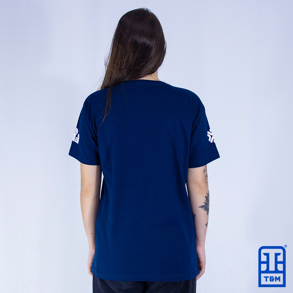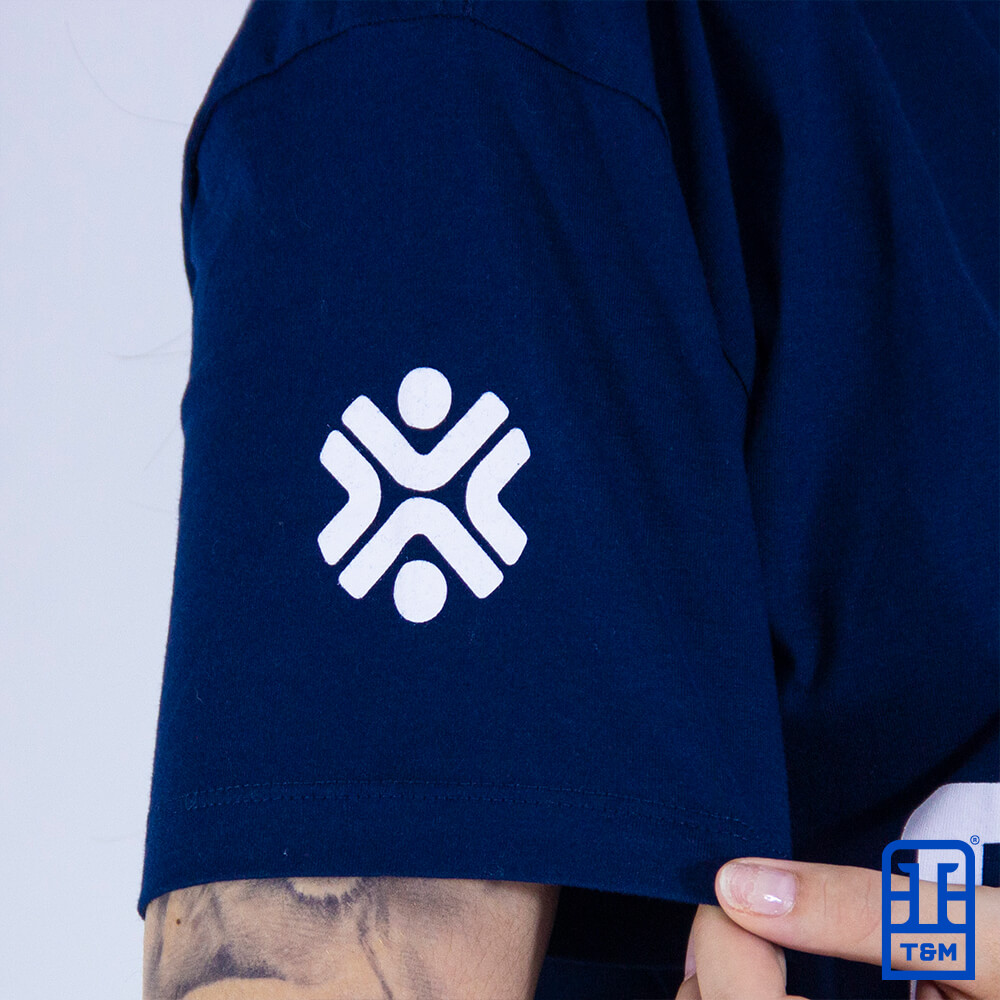 Camiseta azul marinho com estampa em silk na frente e nas mangas.