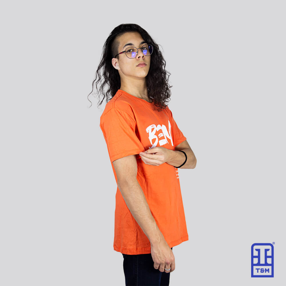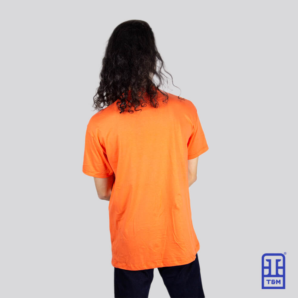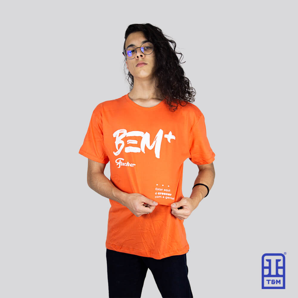 Camiseta laranja com estampa em silk na frente.