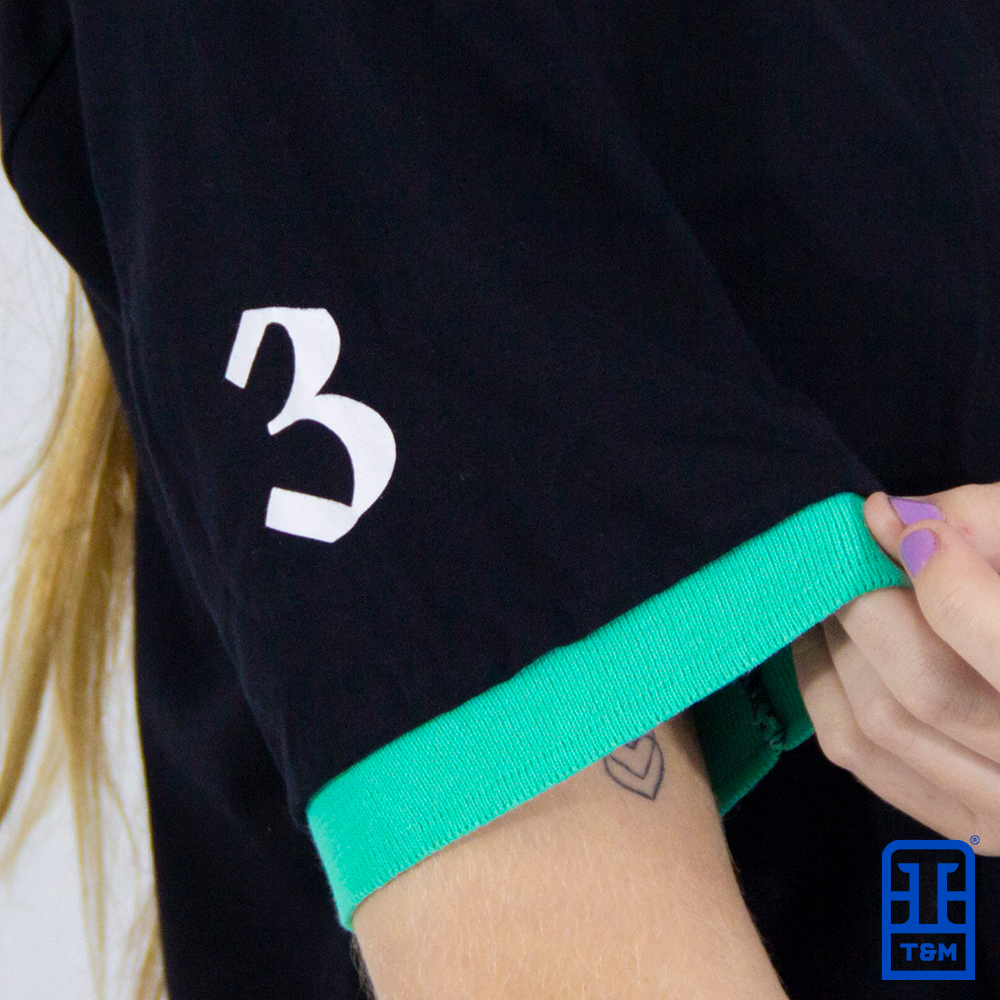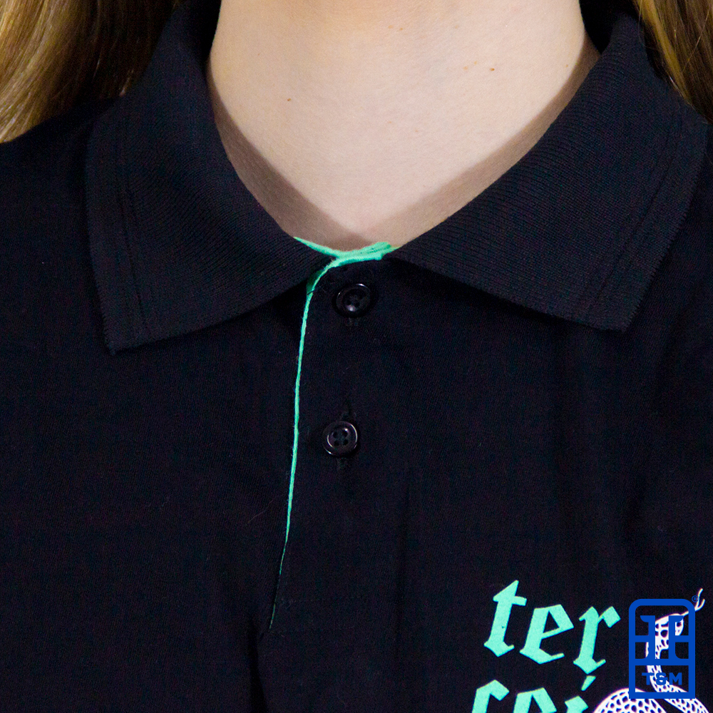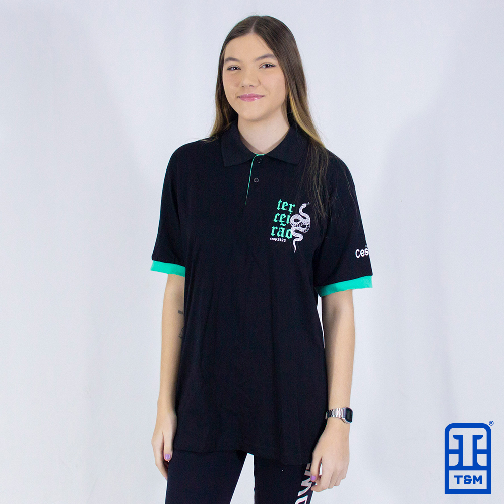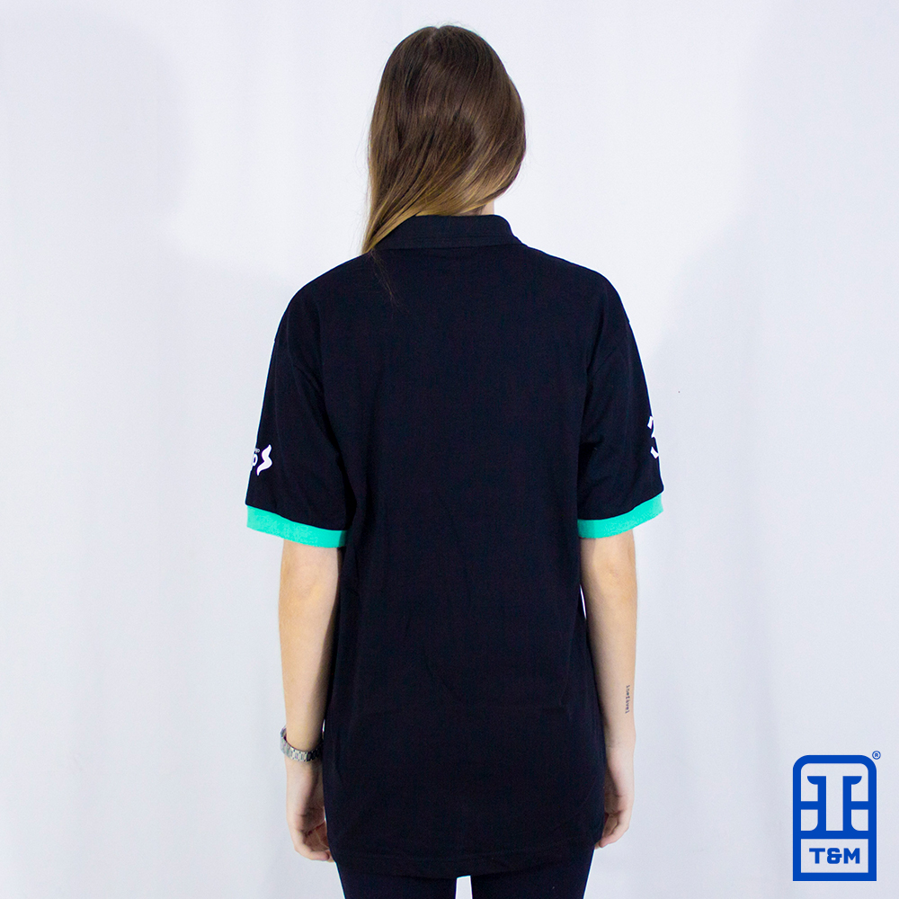 Camiseta polo preta com ribana em verde água. Frente e mangas com estampa em silk.