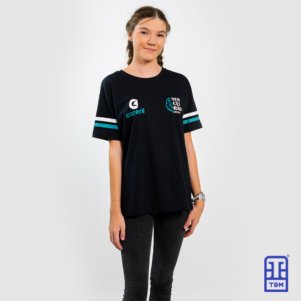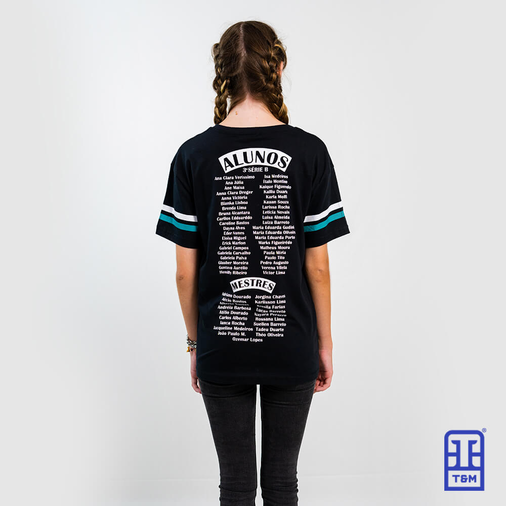 Camiseta preta com estampa em silk na frente, nas mangas e nas costas.