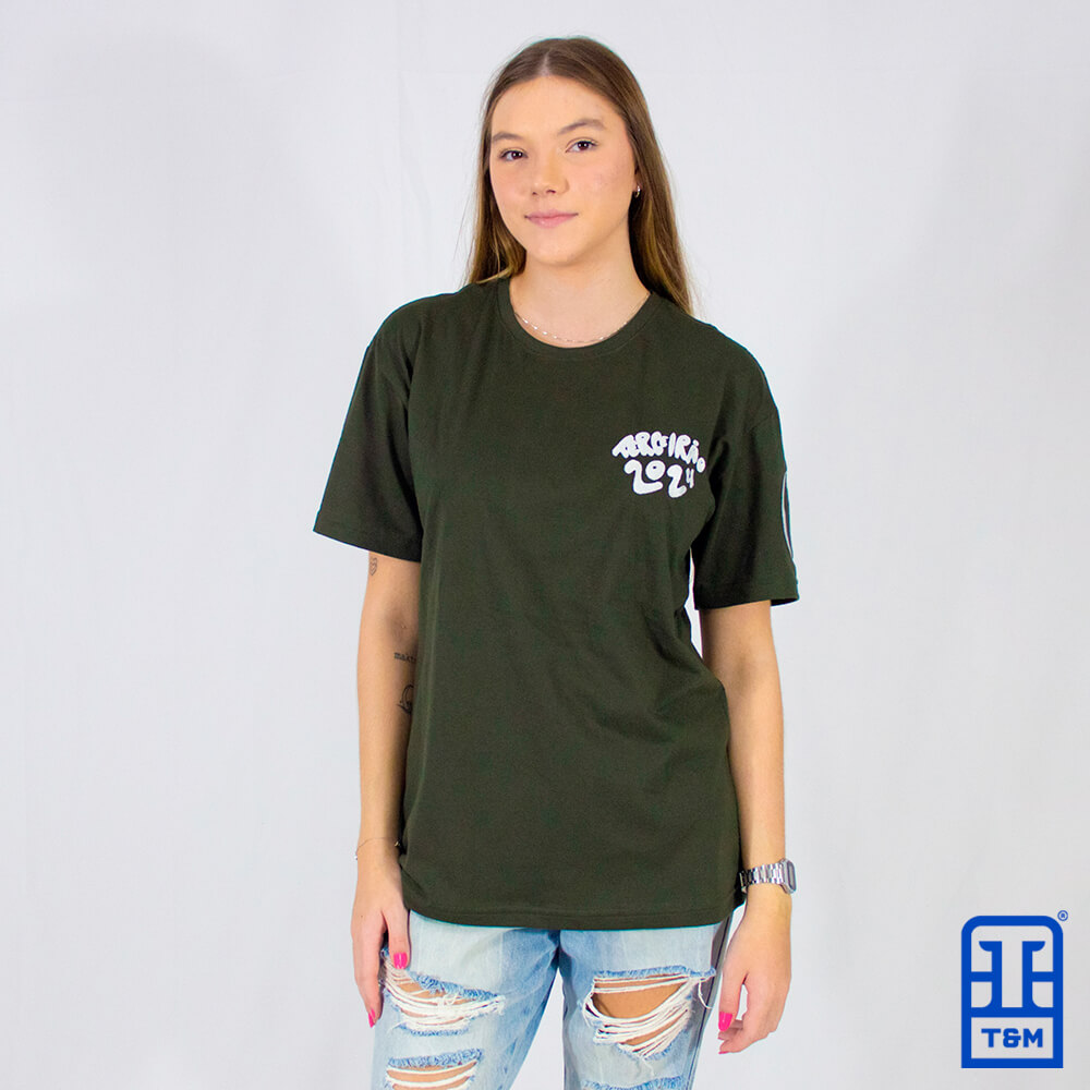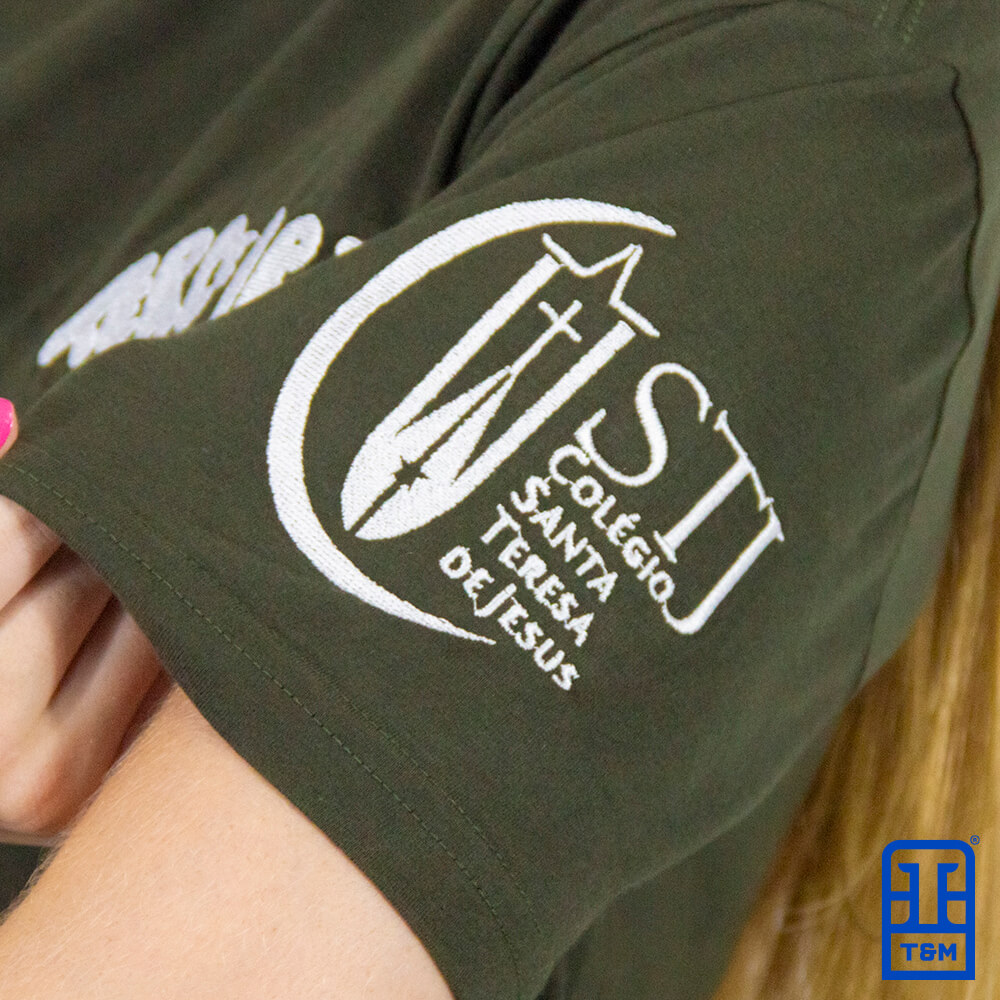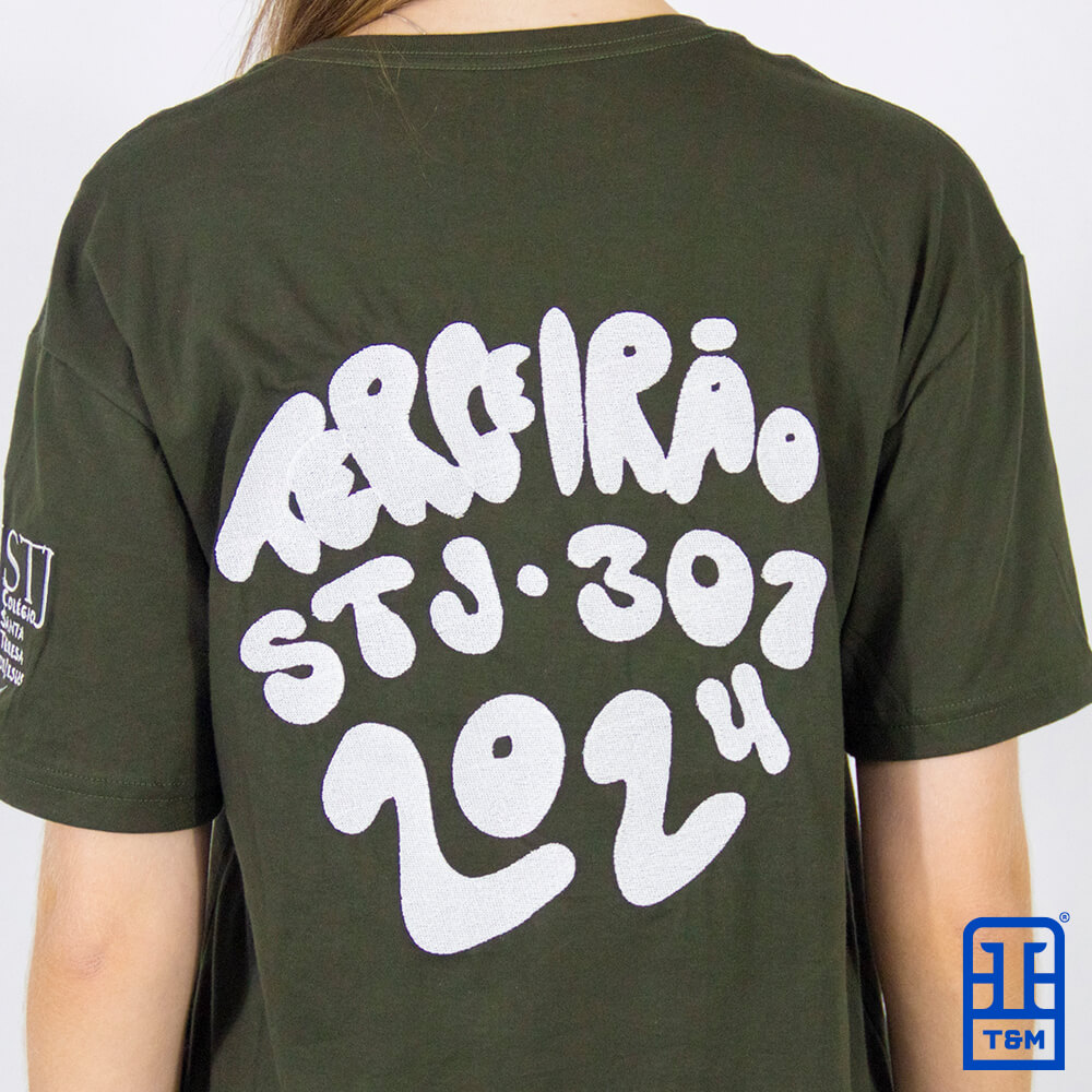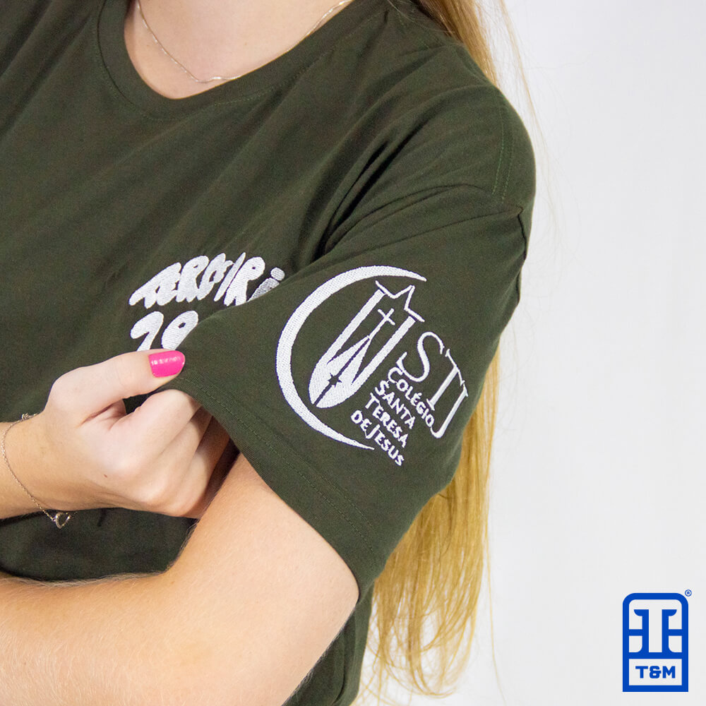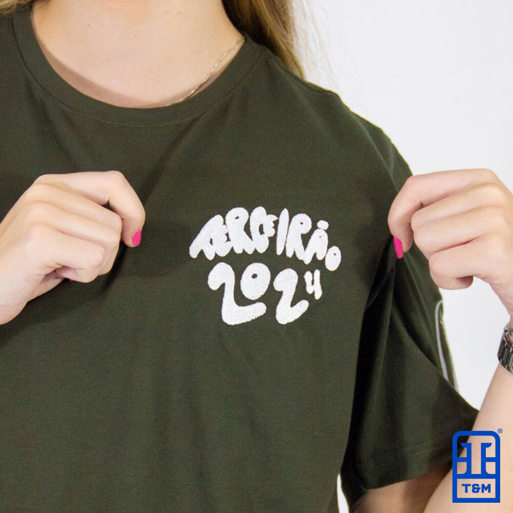 Camiseta verde militar com bordado frente, costas e manga.