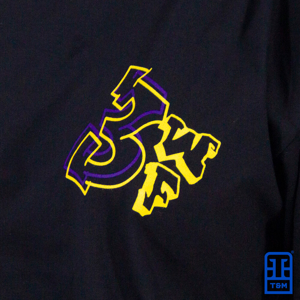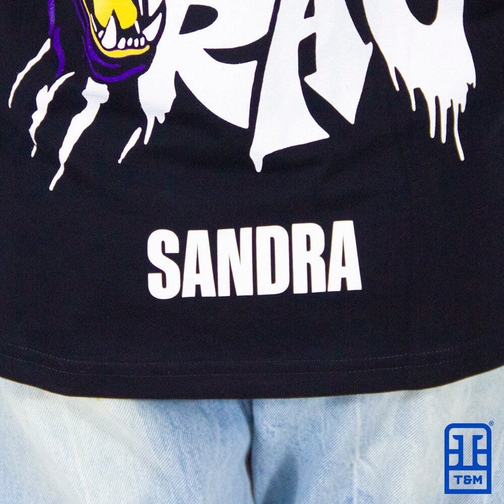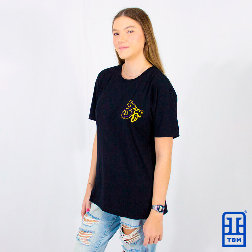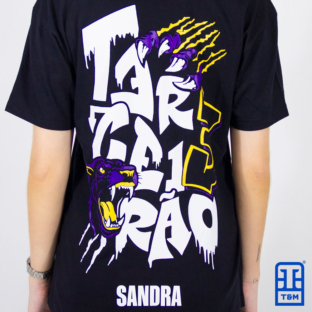 Camiseta preta com estampa em silk frente e costas, aplicação de nome unitário.