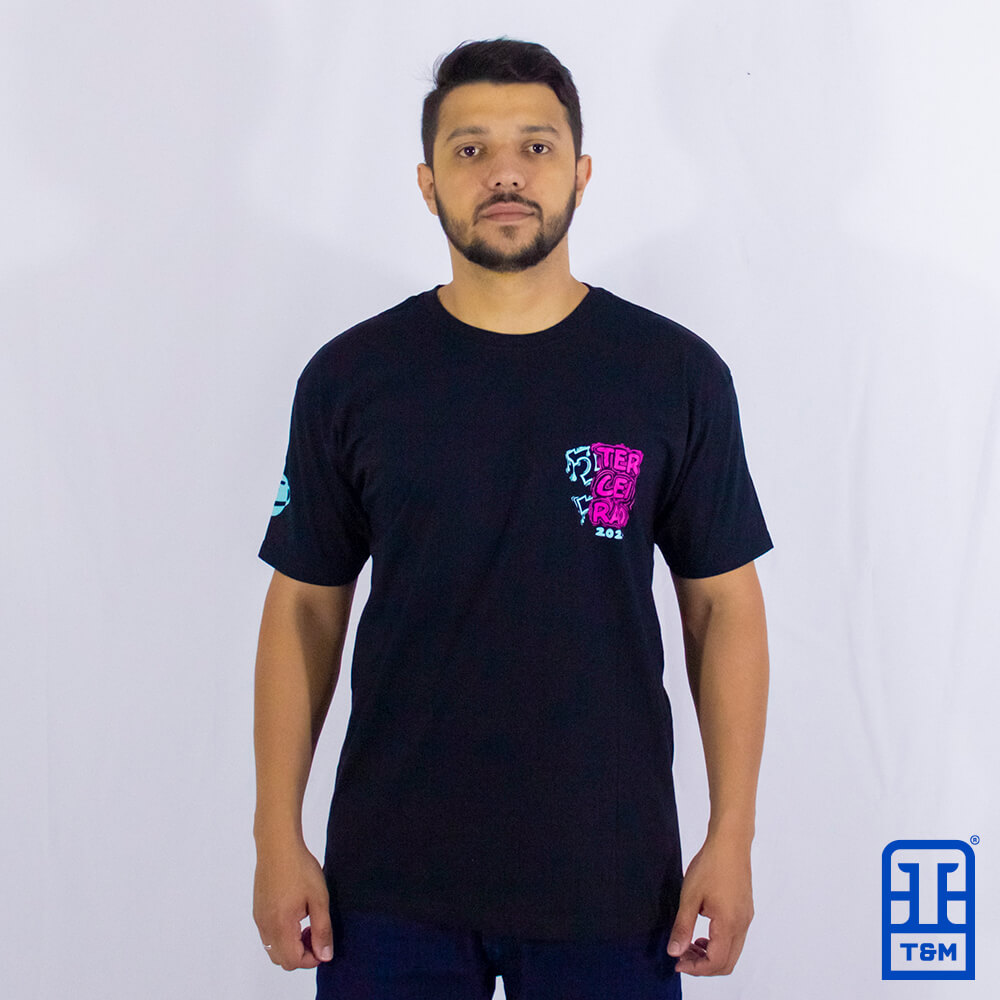Camiseta preta com estampa em silk frente e costas. Peça com aplicação de nome unitário.
