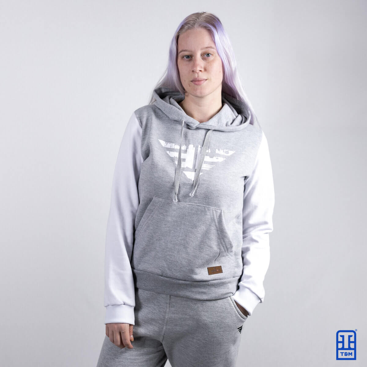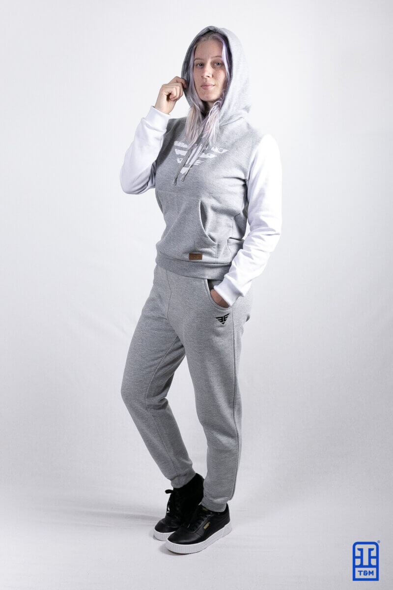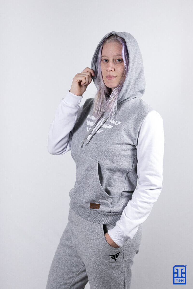 Moletom cinza mescla com mangas em branco. Frente com estampa em silk e adicional de etiqueta diferenciada no bolso, enviada pelo cliente.