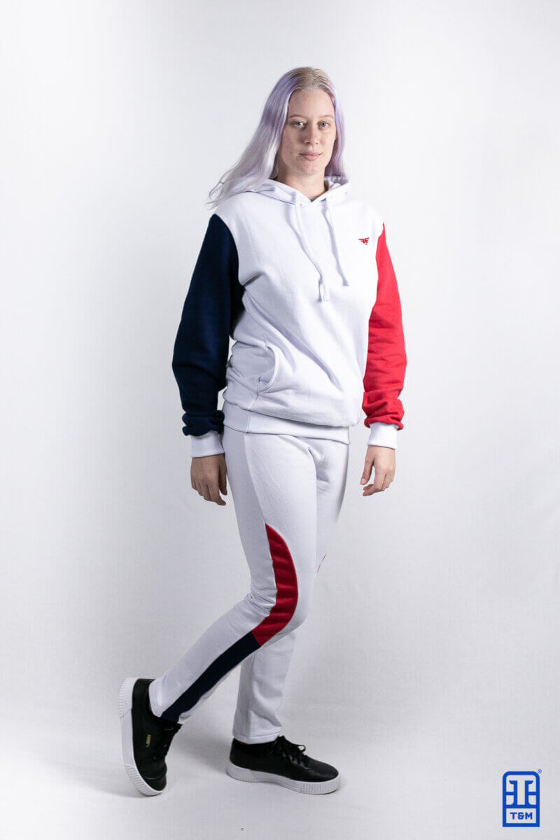 Moletom branco com uma manga azul e outra vermelha. Frente com aplicação de bordado total e adicional de etiqueta diferenciada no bolso, enviada pelo cliente.
