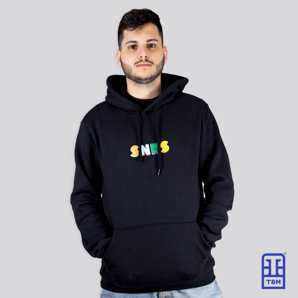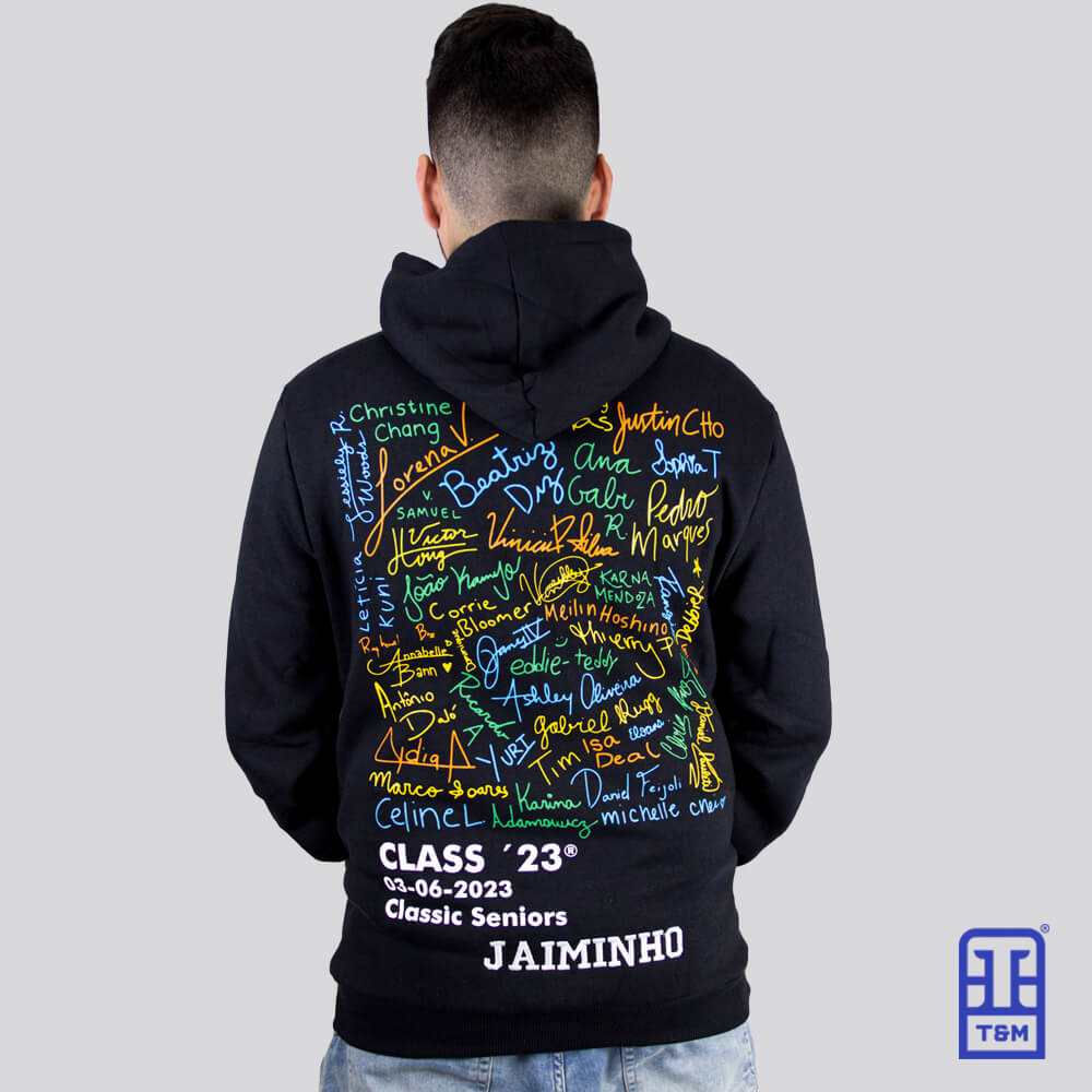 Moletom preto com estampa em silk na frente e nas costas. Aplicação de nome individual nas costas em bordado total.