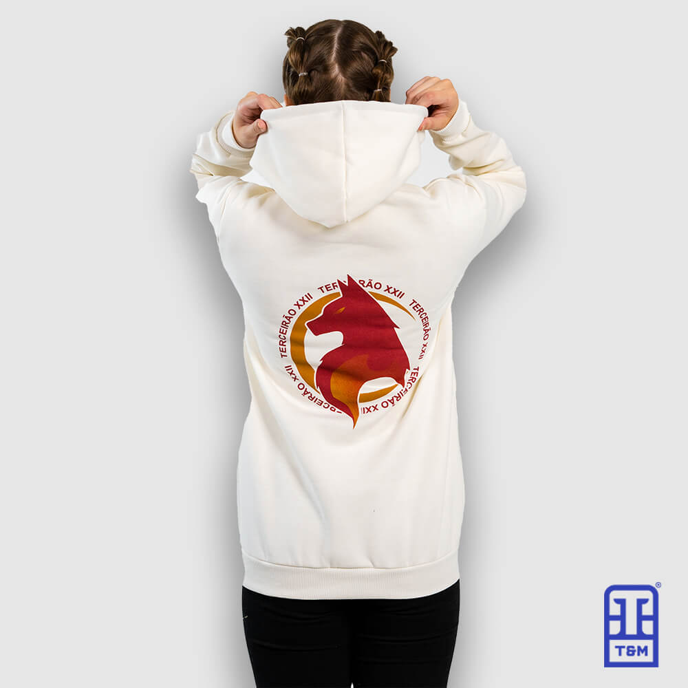 Moletom bege com cordão em bordô, estampa em silk na frente e nas costas.
