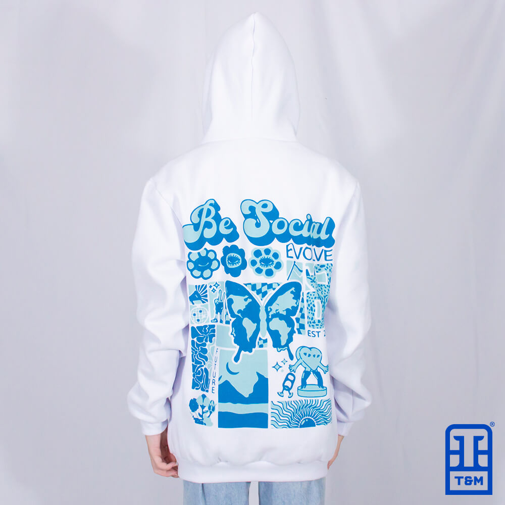 Moletom canguru champagne, frente, e costas com estampa em silk.
