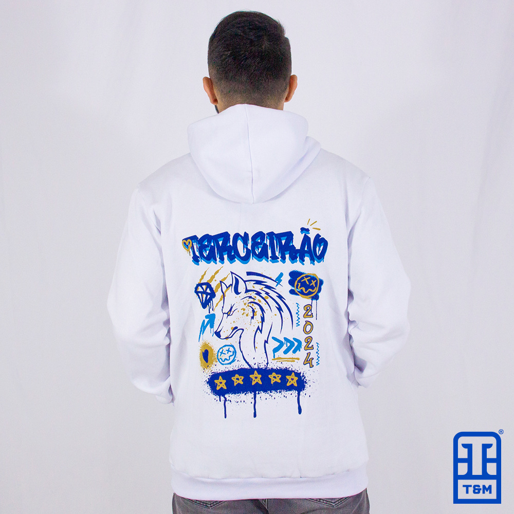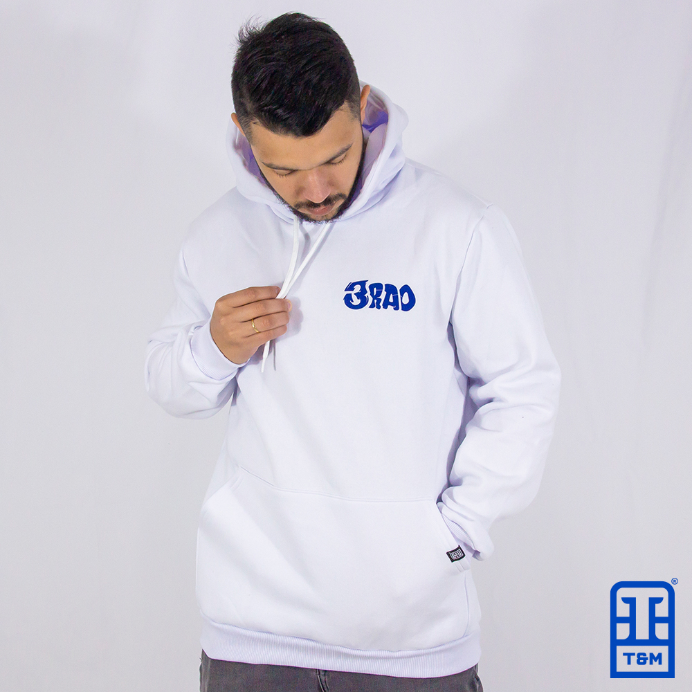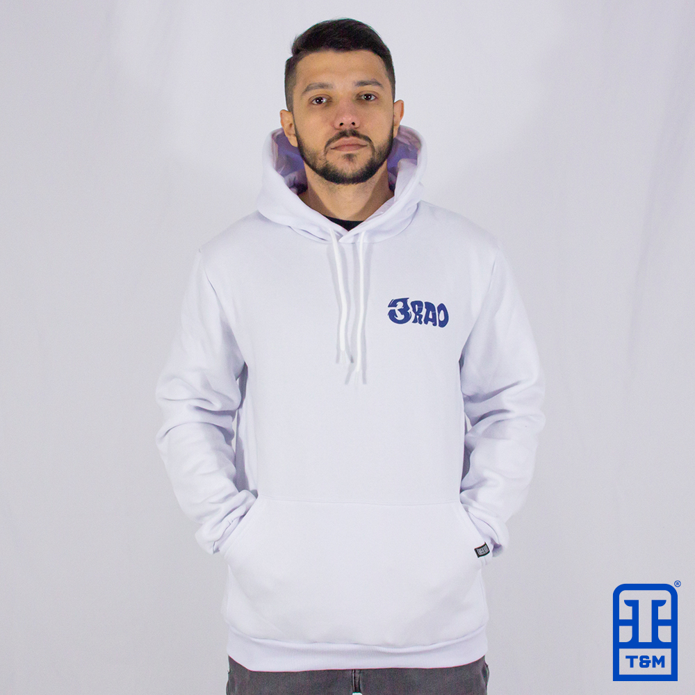 Moletom canguru branco, frente e costas com estampa em silk.