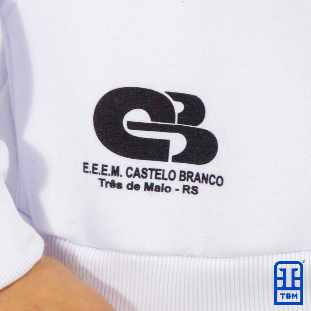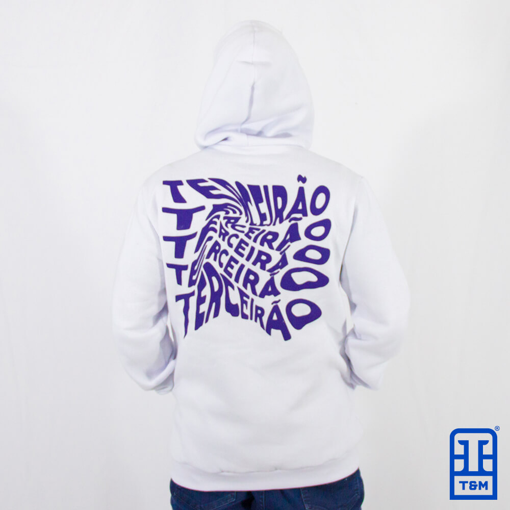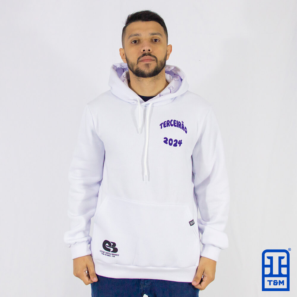 Moletom para Terceirão Canguru Branco com forro de capuz sublimado. Estampa em silk frente e costas.