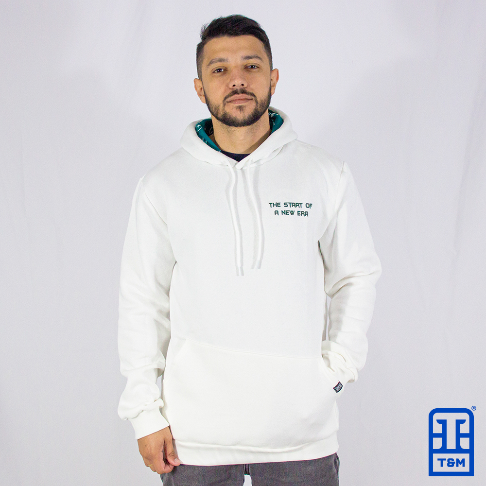 Moletom canguru champagne com forro de capuz sublimado. Frente e costas com estampa em silk.