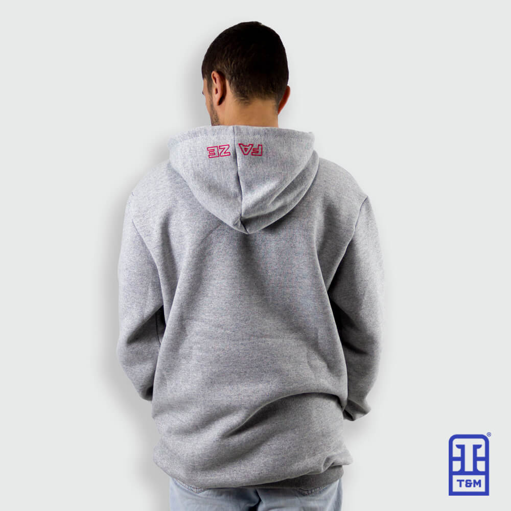 Moletom cinza mescla com estampa em silk na frente e na parte externa do capuz.