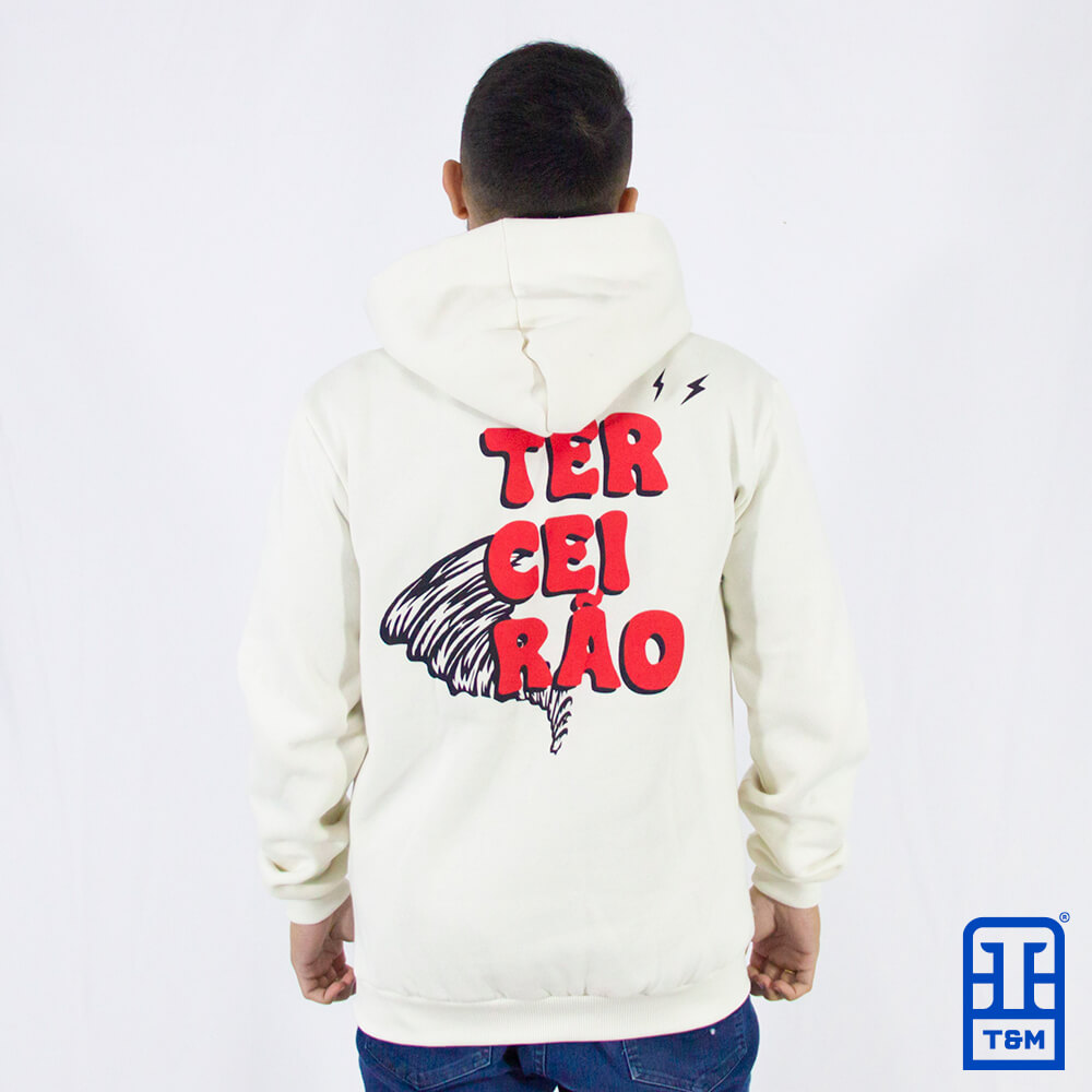 Moletom canguru champagne com bordado total na frente e estampa em silk nas costas.