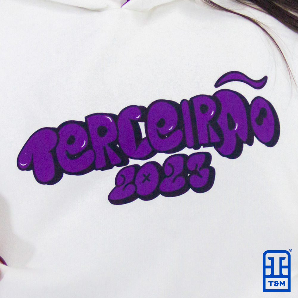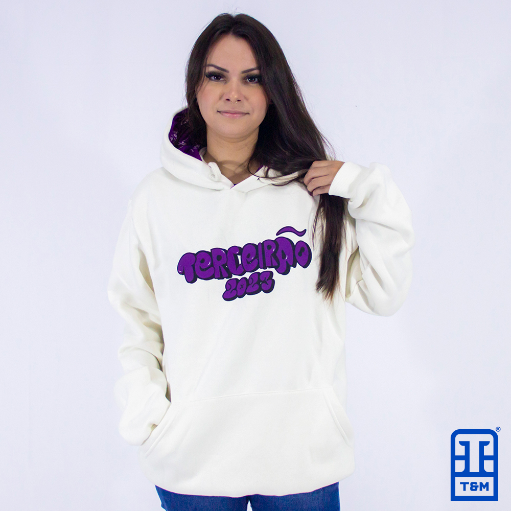 Moletom canguru champagne com forro do capuz sublimado. Estampa em silk frente e costas.