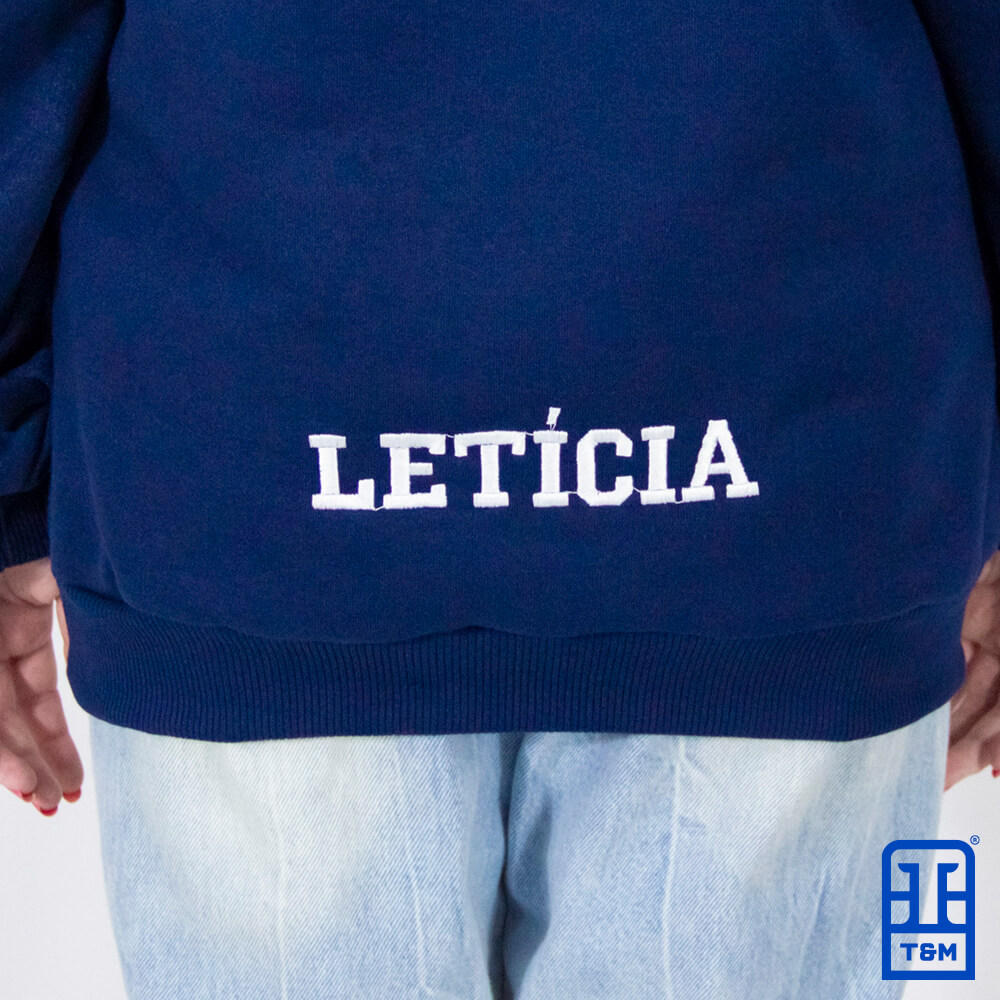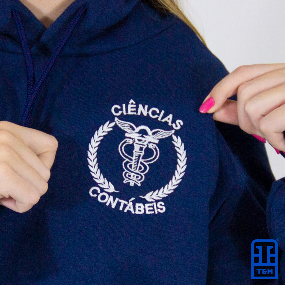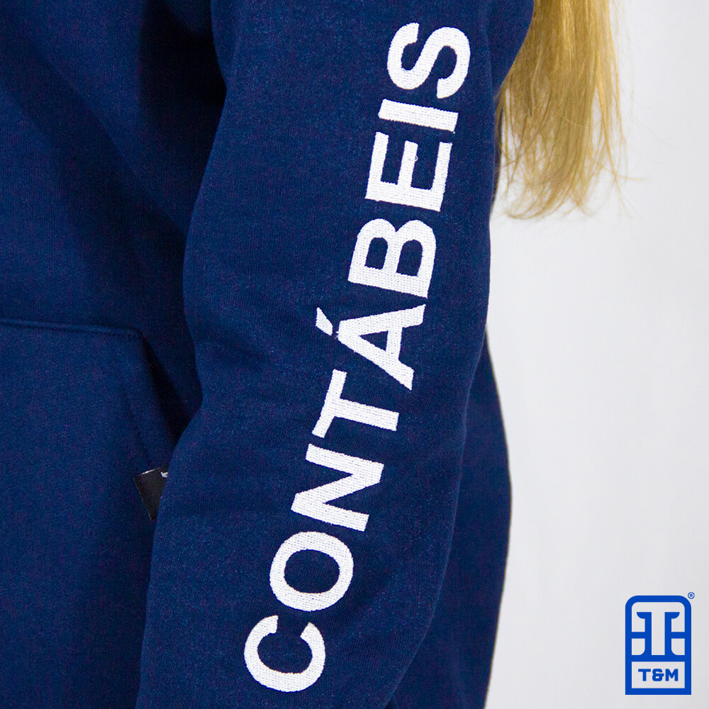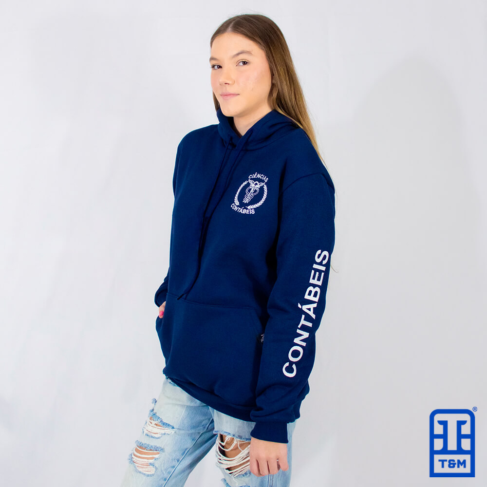 Moletom canguru azul marinho com bordado frente, manga e costas.