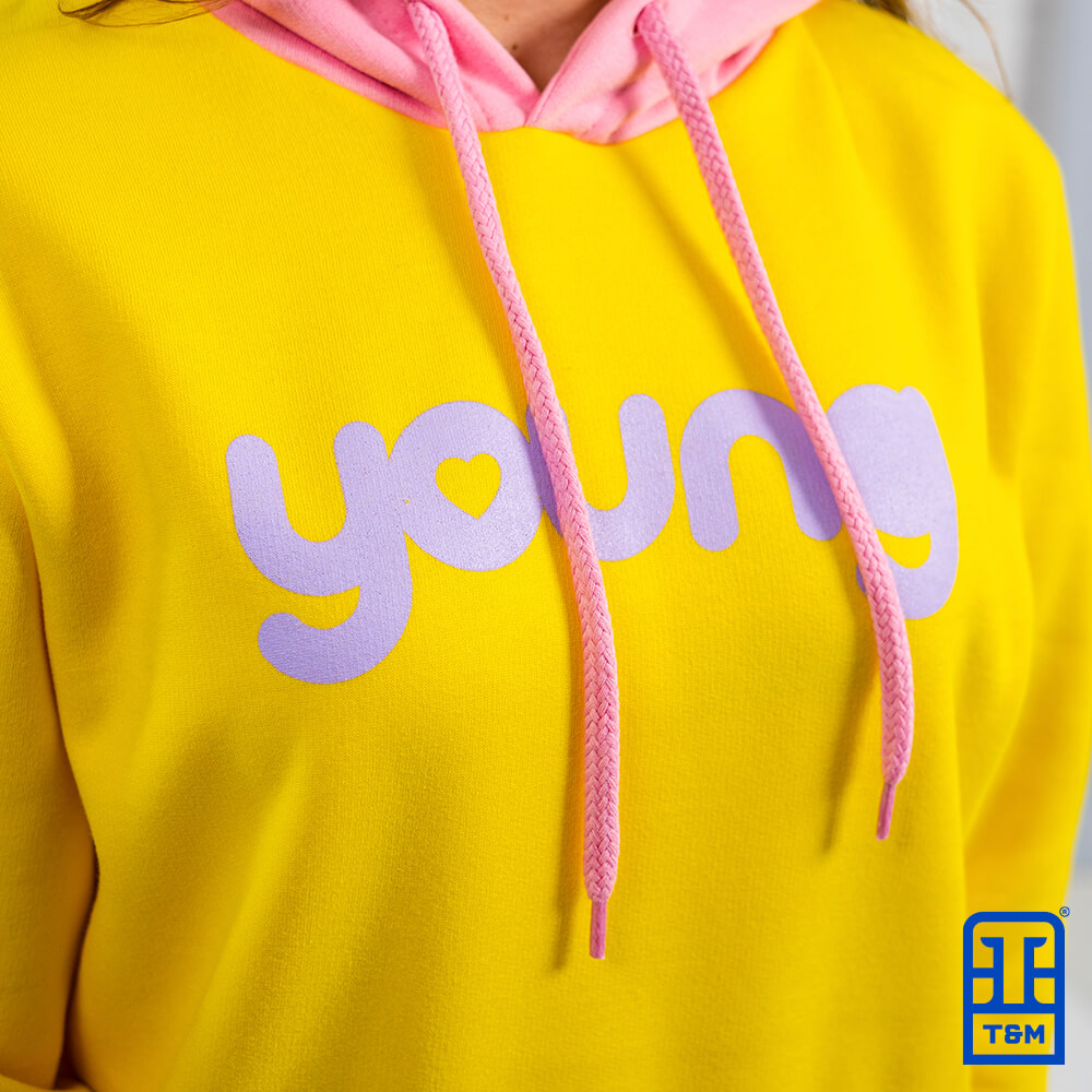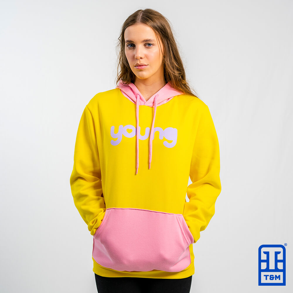 Moletom canguru amarelo com bolsos e capuz em rosa. Frente com estampa em silk.