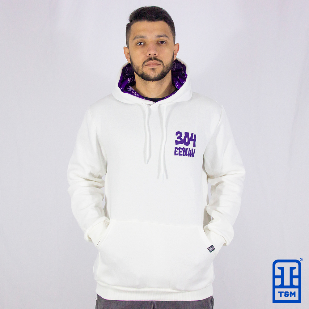 Moletom canguru champagne com forro de capuz sublimado. Frente e costas com estampa em silk.
