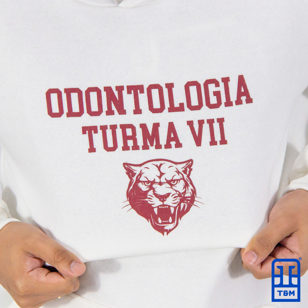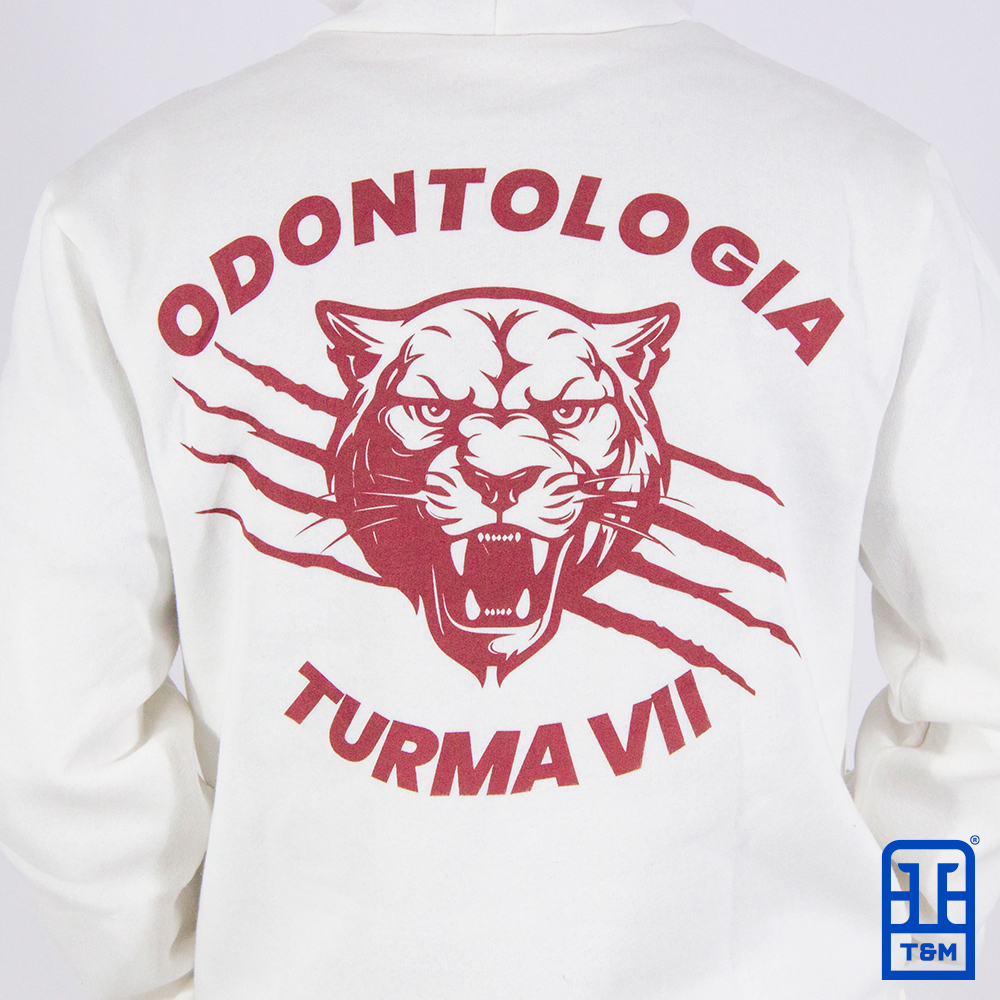 Moletom canguru champagne com forro de capuz em bordô. Frente e costas com estampa em silk.