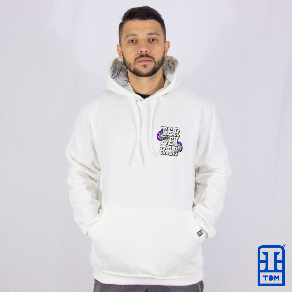 Moletom canguru champagne com forro de capuz sublimado. Frente e costas com estampa em silk. Costas com aplicação de nome unitário.