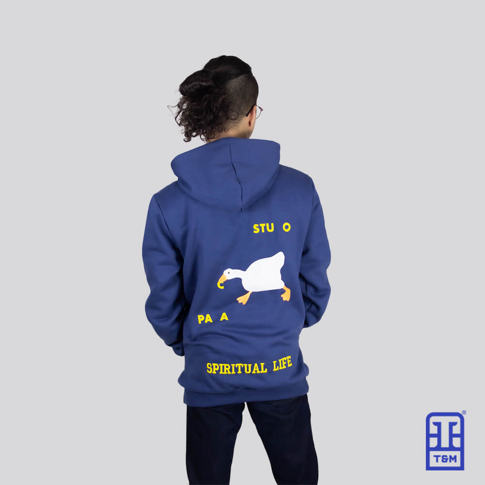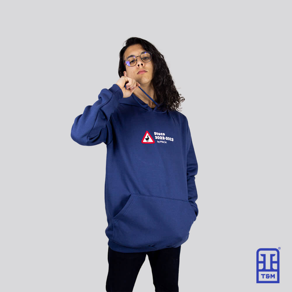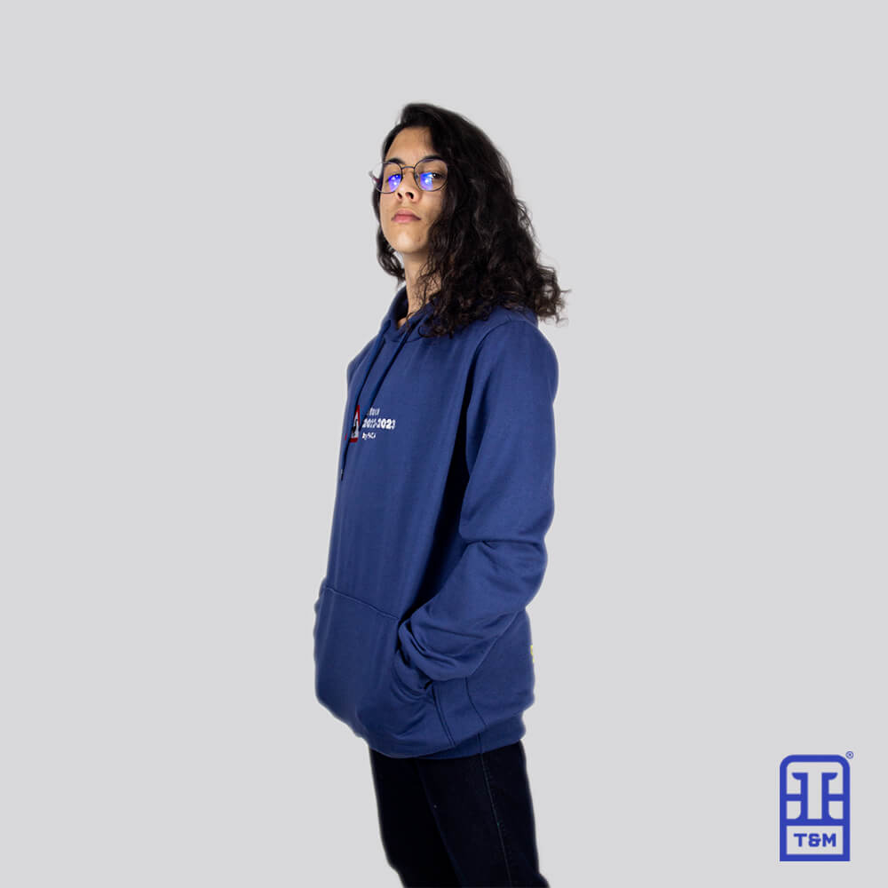 Moletom azul com estampa em silk na frente e nas costas, escrito nas costas em bordado total.
