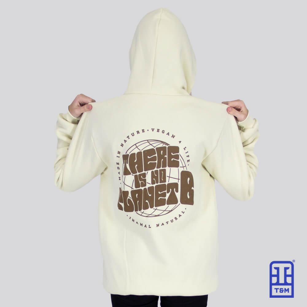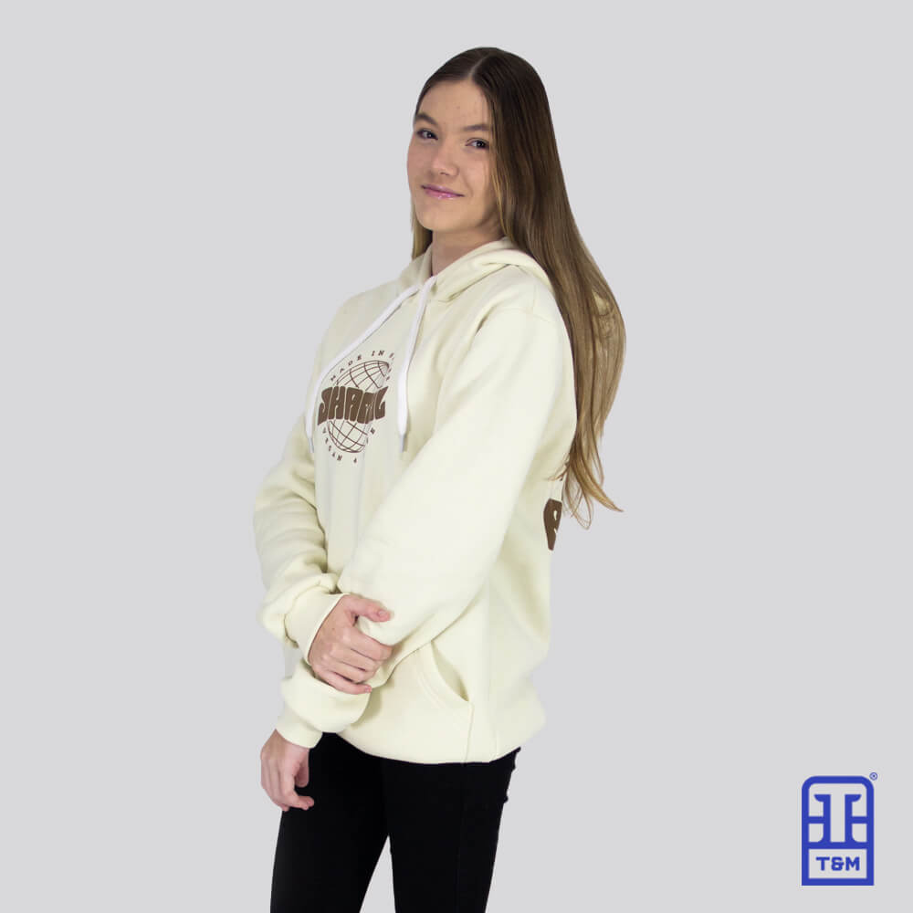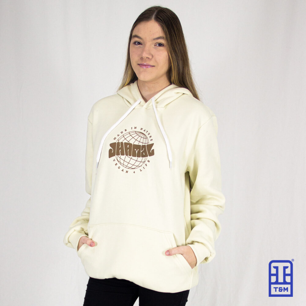 Moletom champagne com cordão branco. Frente e costas com estampa em silk.