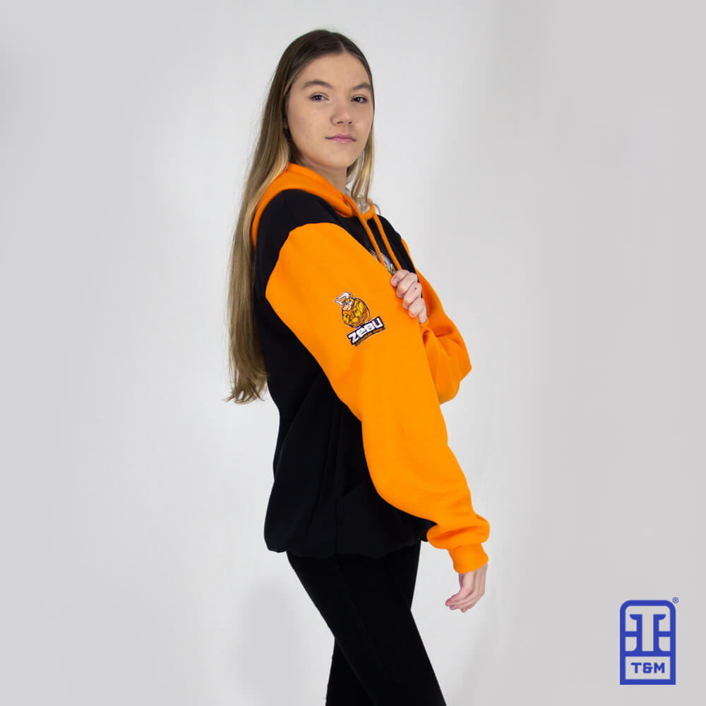 Moletom preto com mangas e capuz em laranja, forro do capuz em branco. Frente com aplicação de bordado total, mangas com estampa em silk.