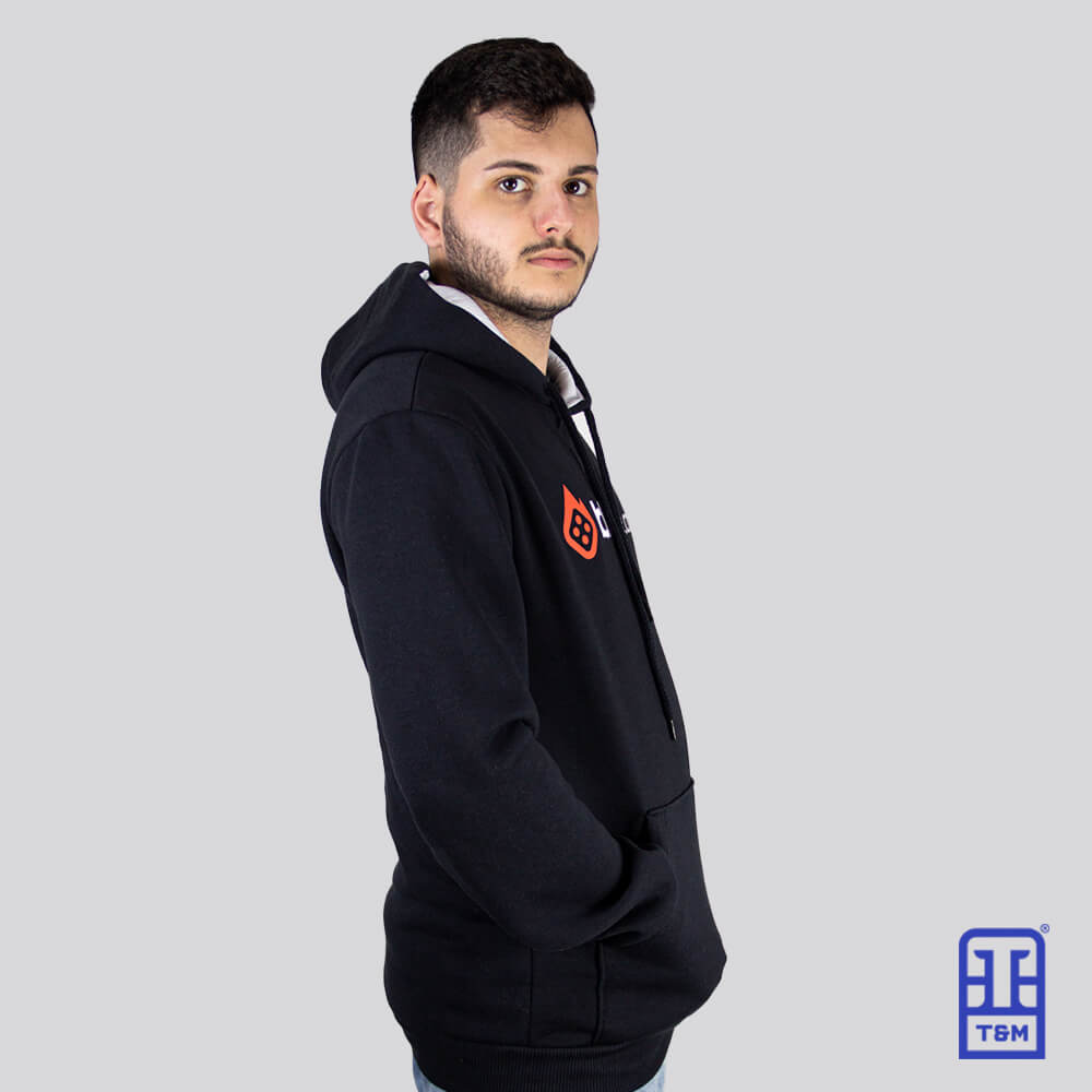 Moletom preto com forro de capuz em branco. Frente e costas com estampa em silk.