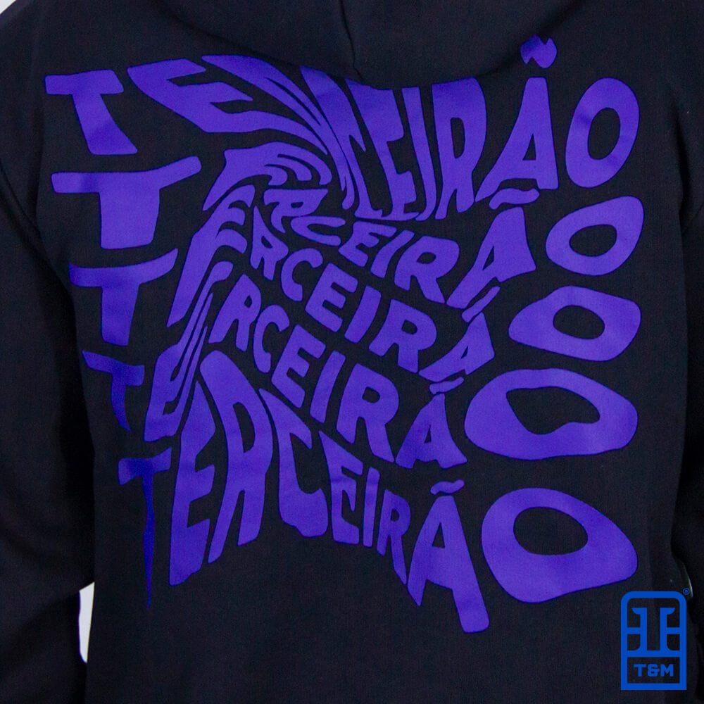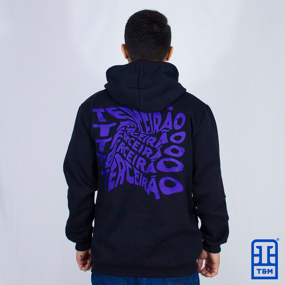 Moletom canguru preto, frente e costas com estampa em silk.