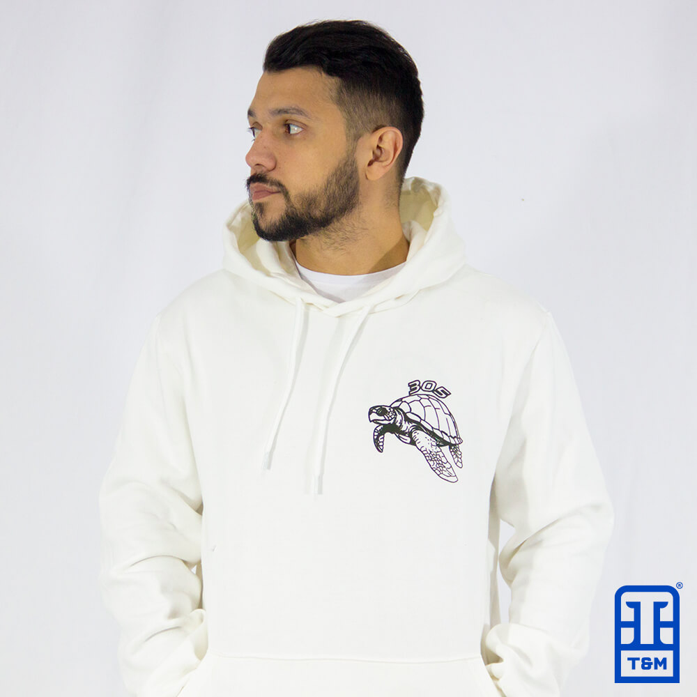 Moletom canguru off white com estampa em silk frente e costas.