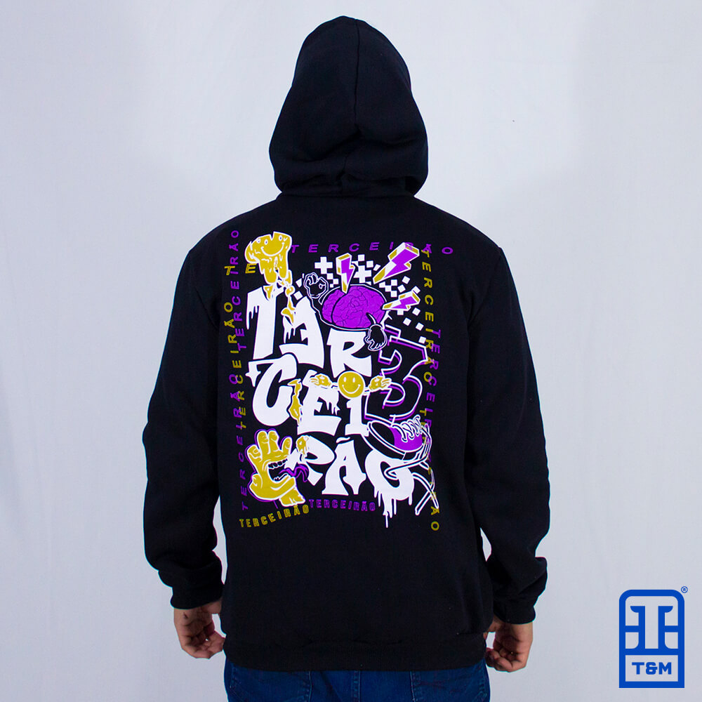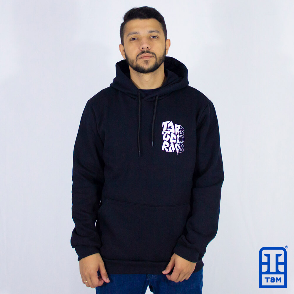 Moletom canguru preto, frente e costas com estampa em silk.