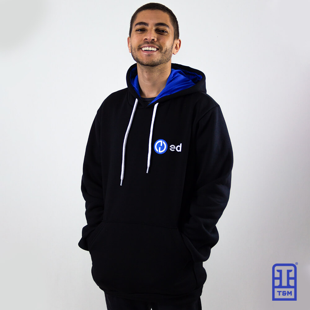 Moletom preto com forro de capuz em azul e cordão em branco. Frente com estampa em silk.
