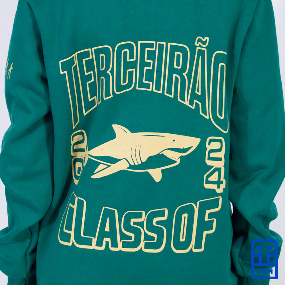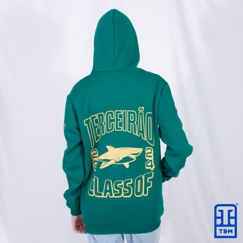 Moletom verde murano com forro de capuz sublimado. Frente, mangas e costas com estampa em silk.