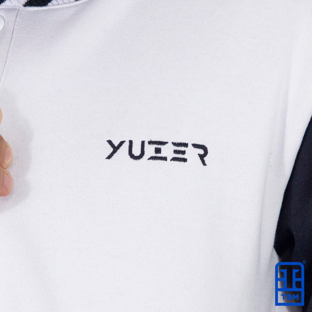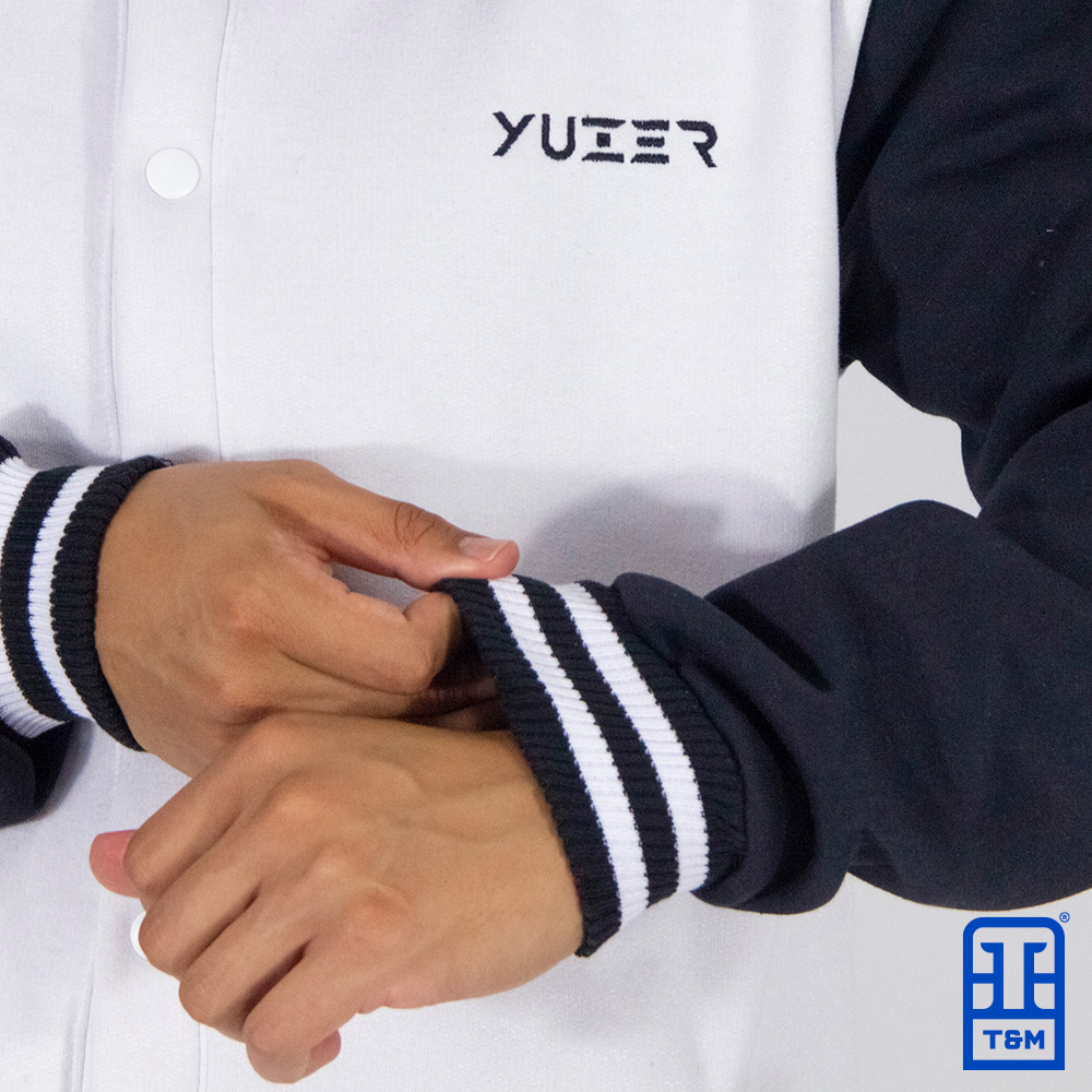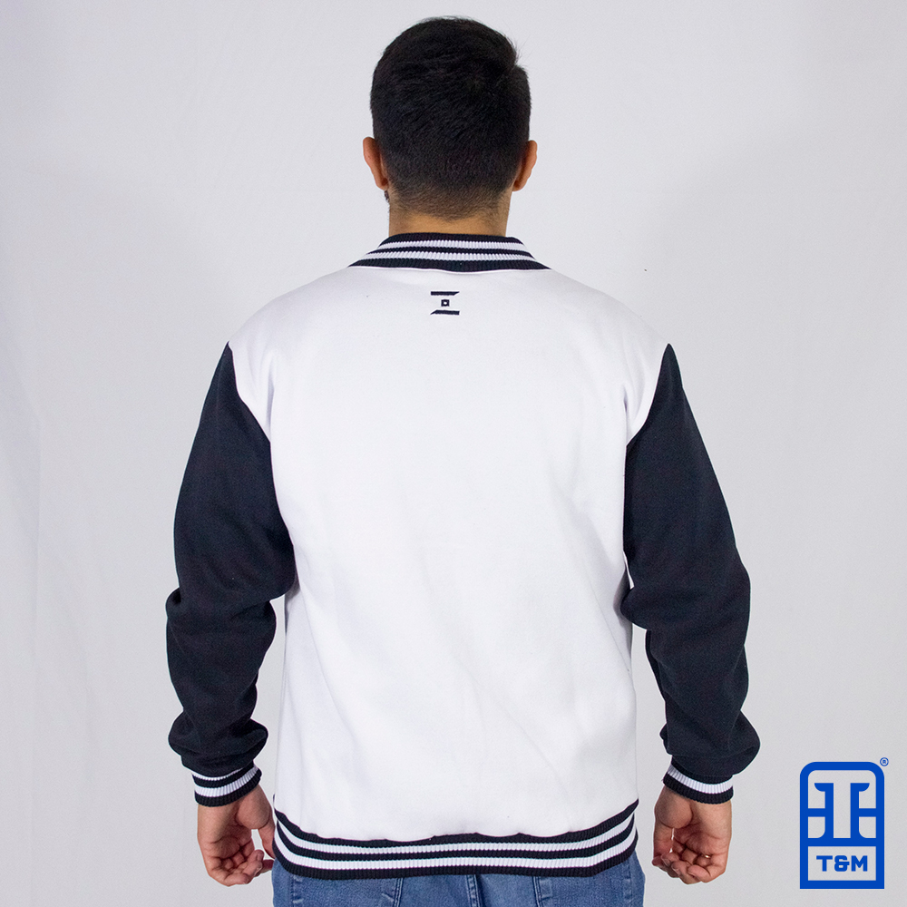 Moletom colegial para empresa na cor branca com mangas pretas. Produzido para a empresa yuzer. Blusa de Moletom estilo colegial de composição 50% algodão e 50% poliéster. Moletom peluciado, 3 cabos de gramatura 350g/cm³. Acabamento dos punhos e da barra em ribana acrílica de excelente qualidade, botões em latão. Pode ser feito com ou sem capuz.