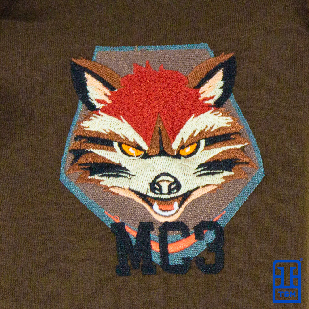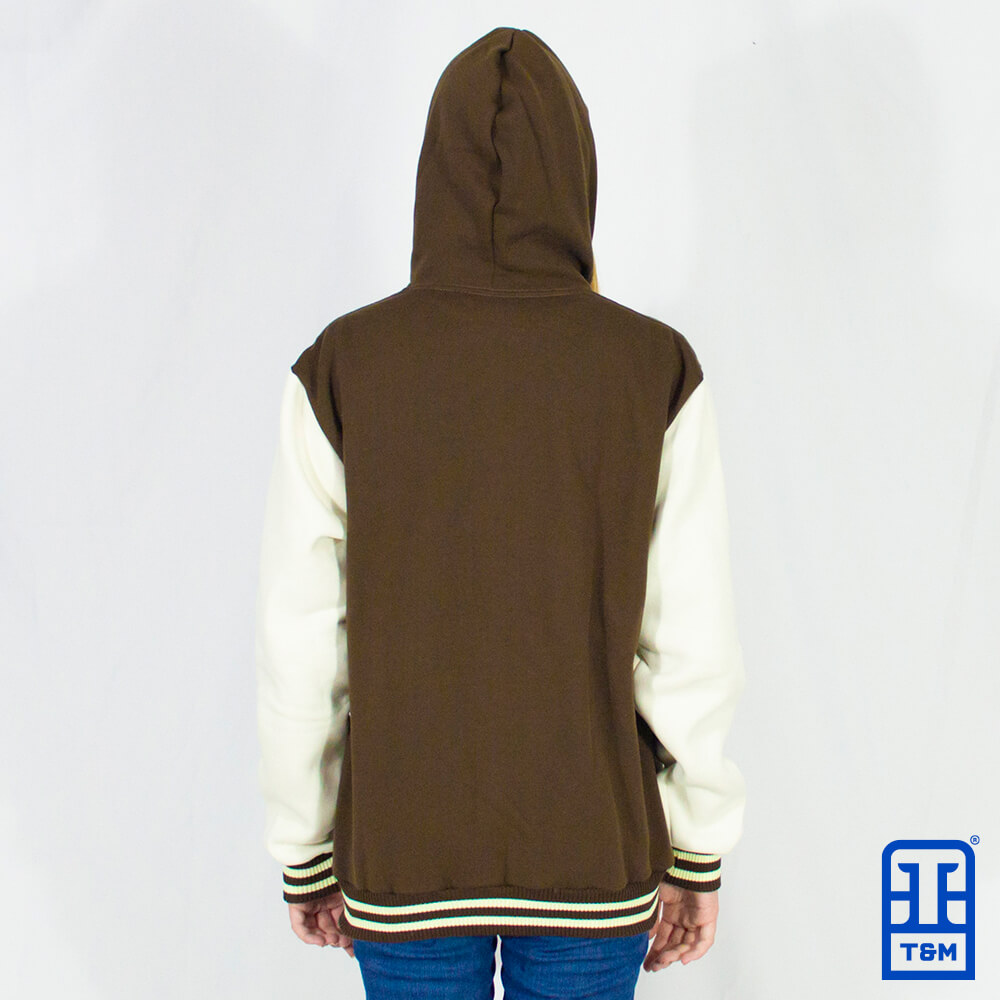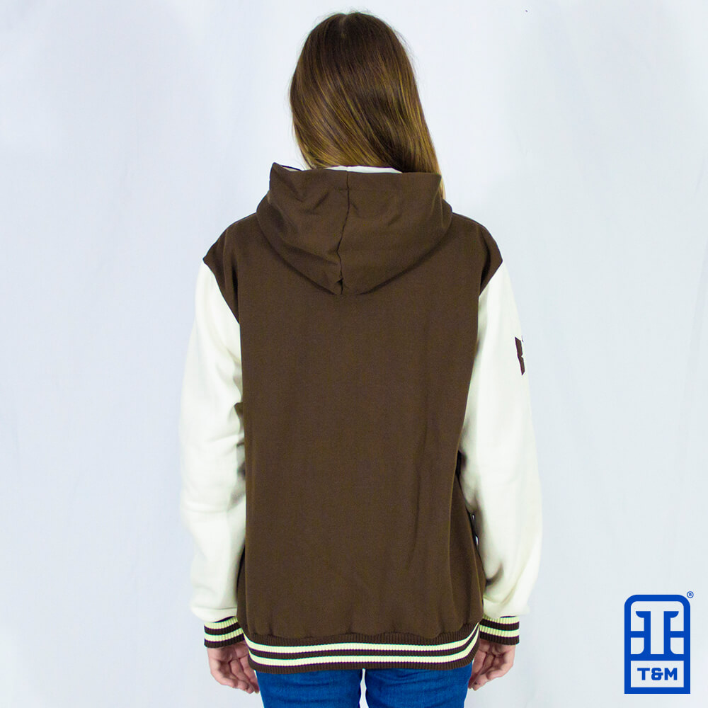 Moletom colegial marrom com forro de capuz e mangas em champagne. Frente e manga com bordado total.