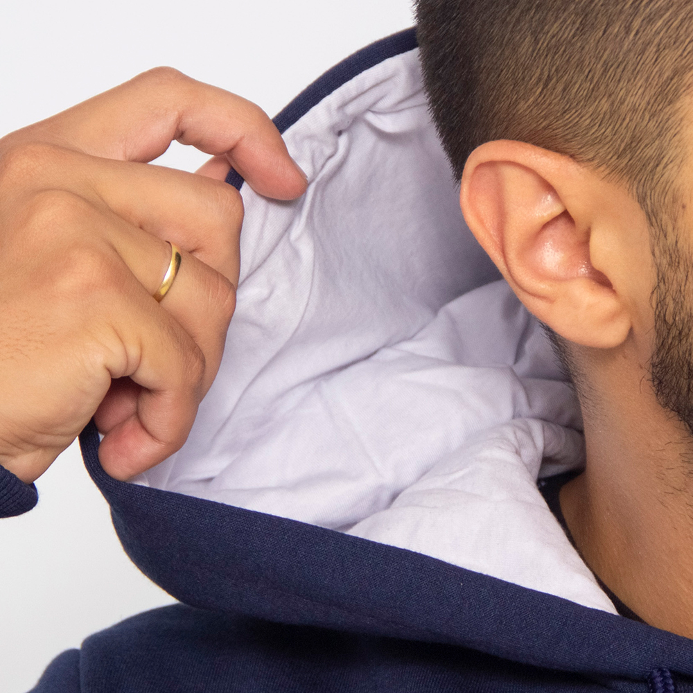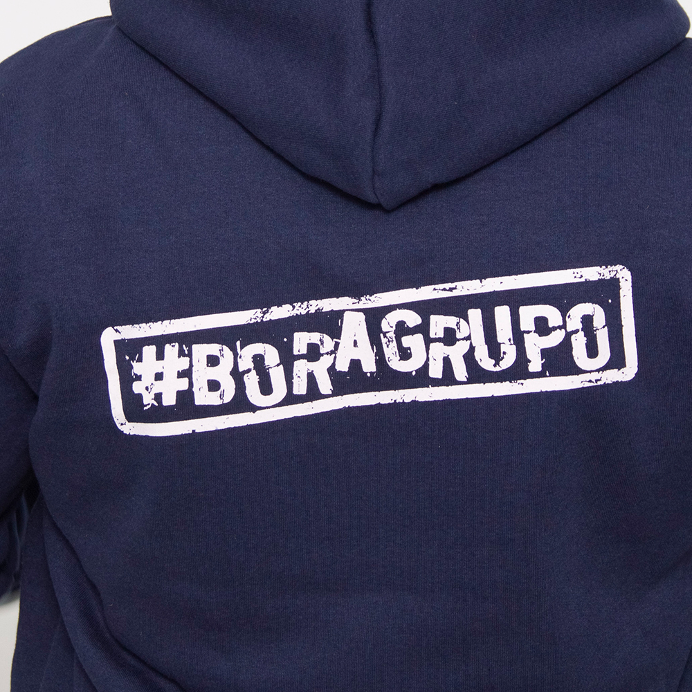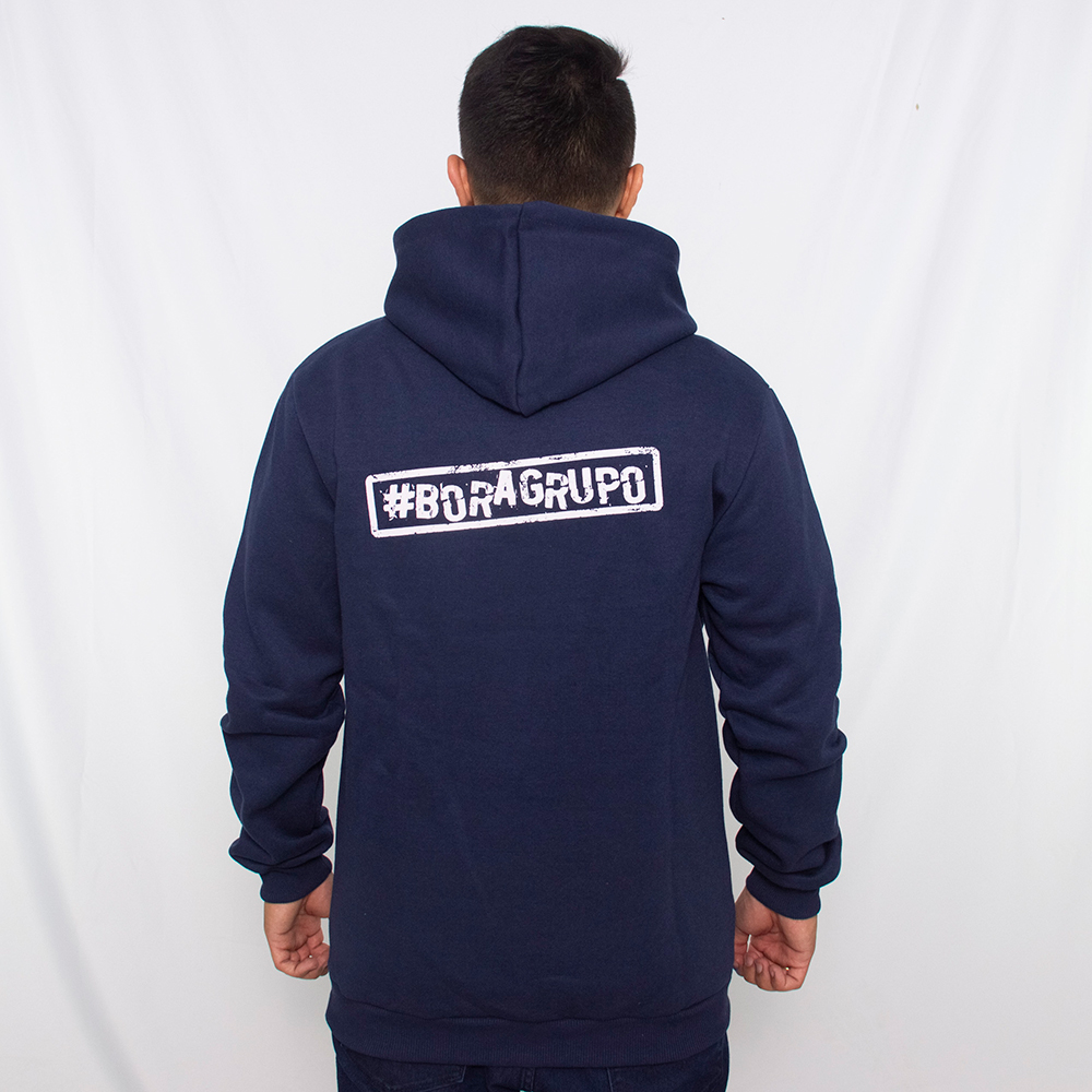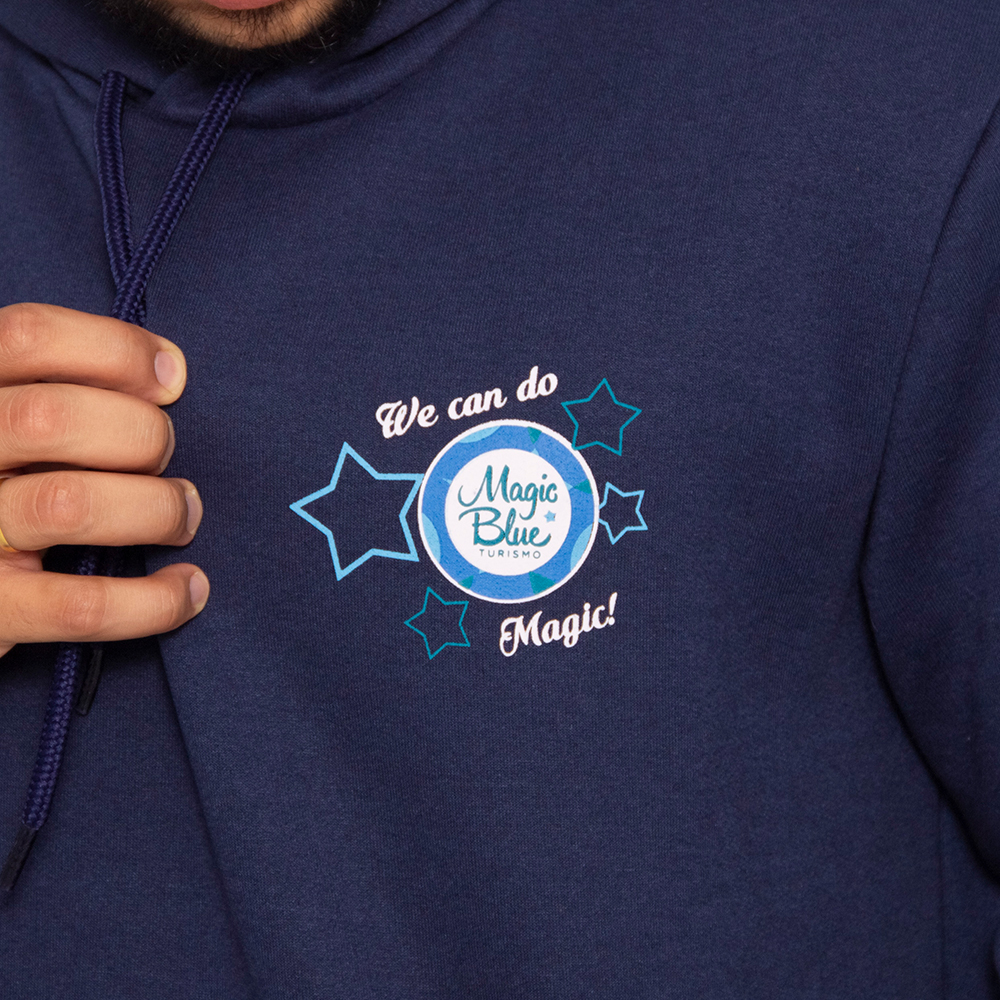 Moletom canguru para empresa na cor azul. Produzido para a empresa Magic Blue. Moletom Canguru é feito de material 50% algodão e 50% poliéster. Moletom 3 cabos, peluciado, de gramatura 350g/cm³. Malha interna no capuz de composição 100% algodão fio 30/1 penteado. Possui cordão.