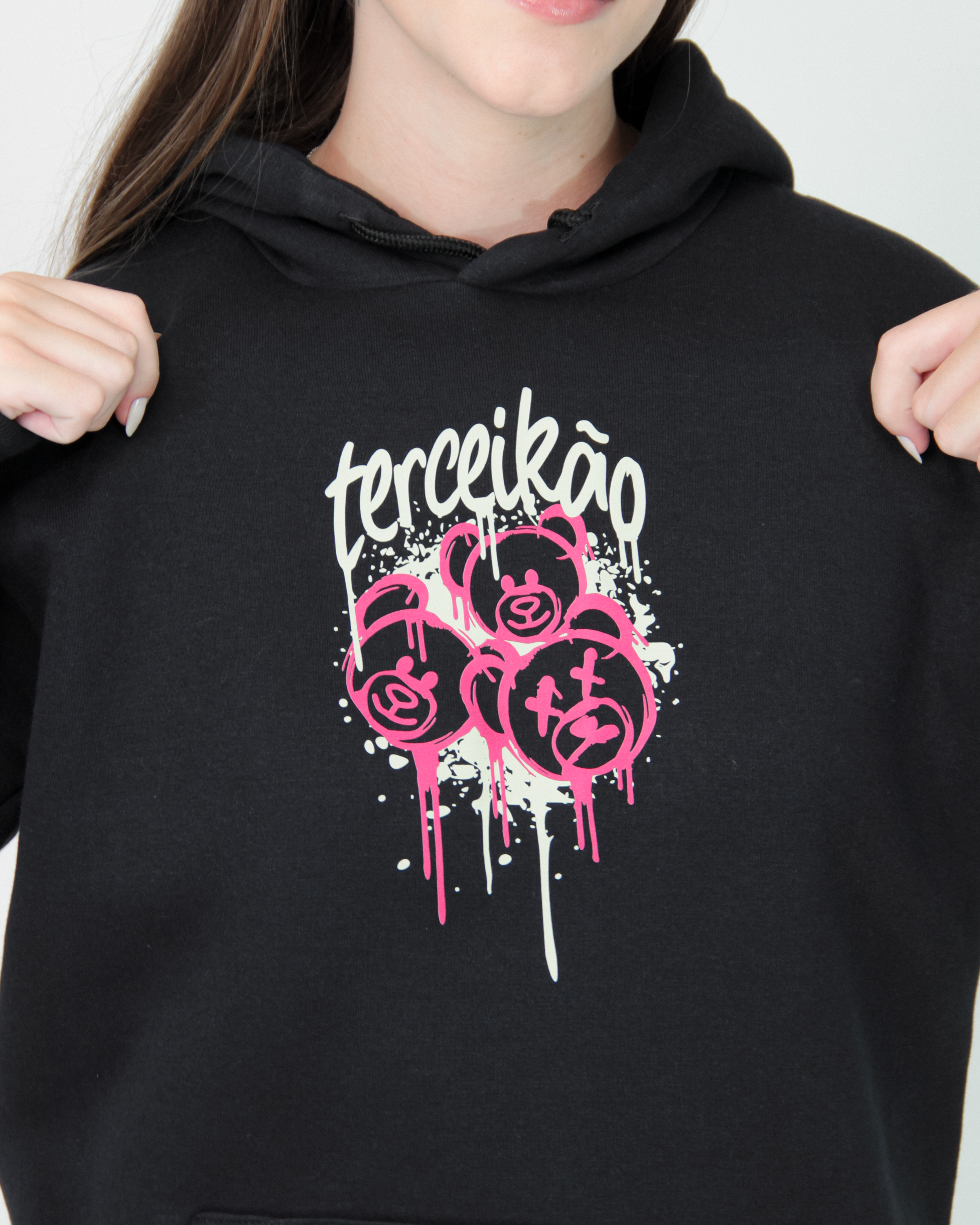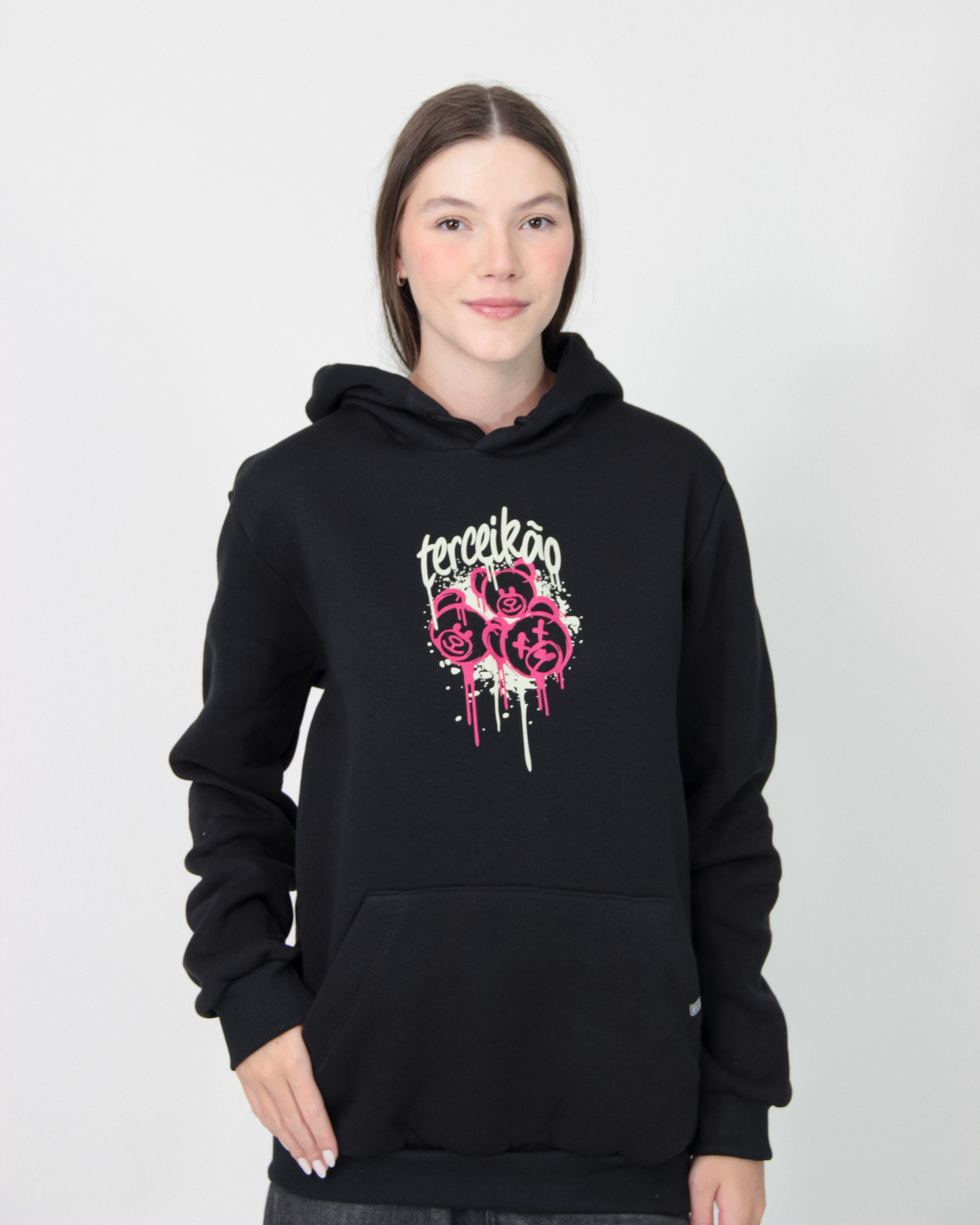 Moletom Canguru é feito de material 50% algodão e 50% poliéster. Moletom 3 cabos, peluciado, de gramatura 350g/cm³. Malha interna no capuz de composição 100% algodão fio 30/1 penteado. Possui cordão.
