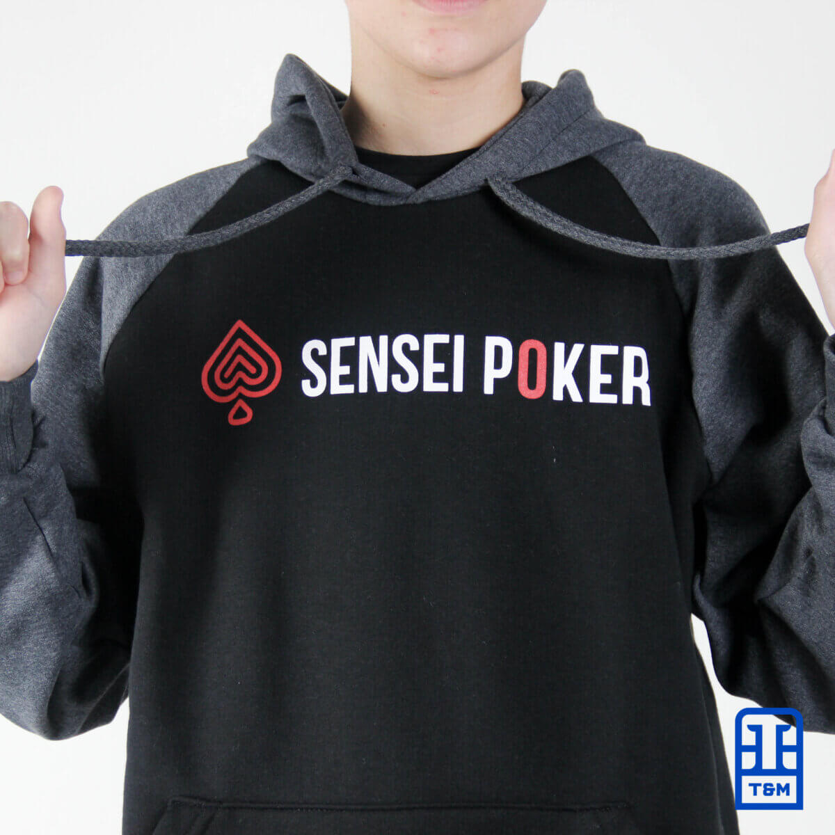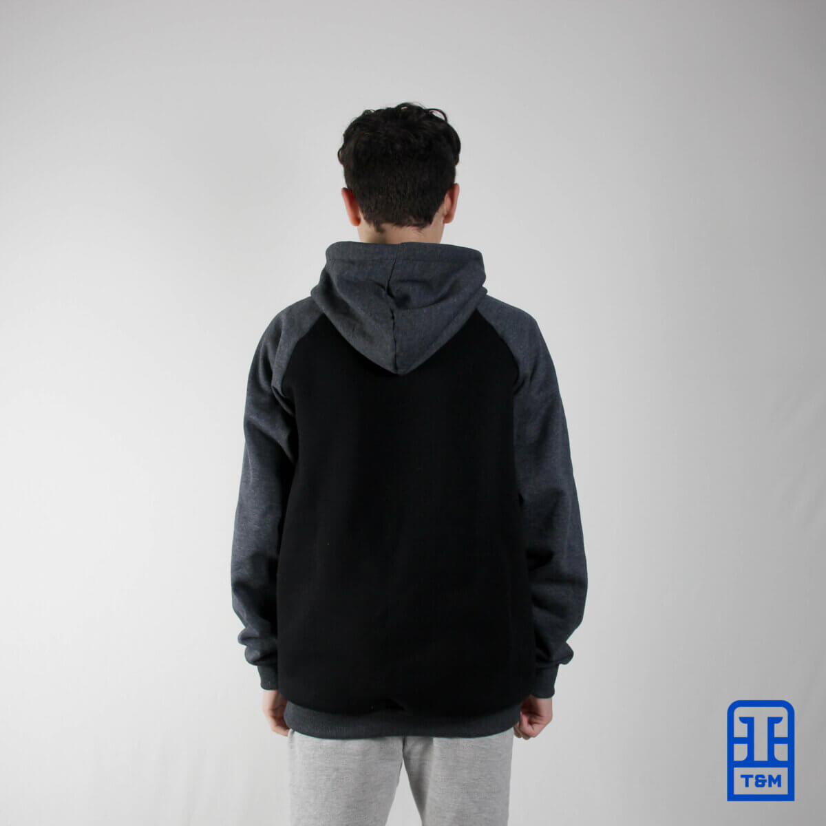 Moletom raglan com corpo na cor preta e mangas e capuz contrastantes em grafite. Na frente possui uma estampa em duas cores.